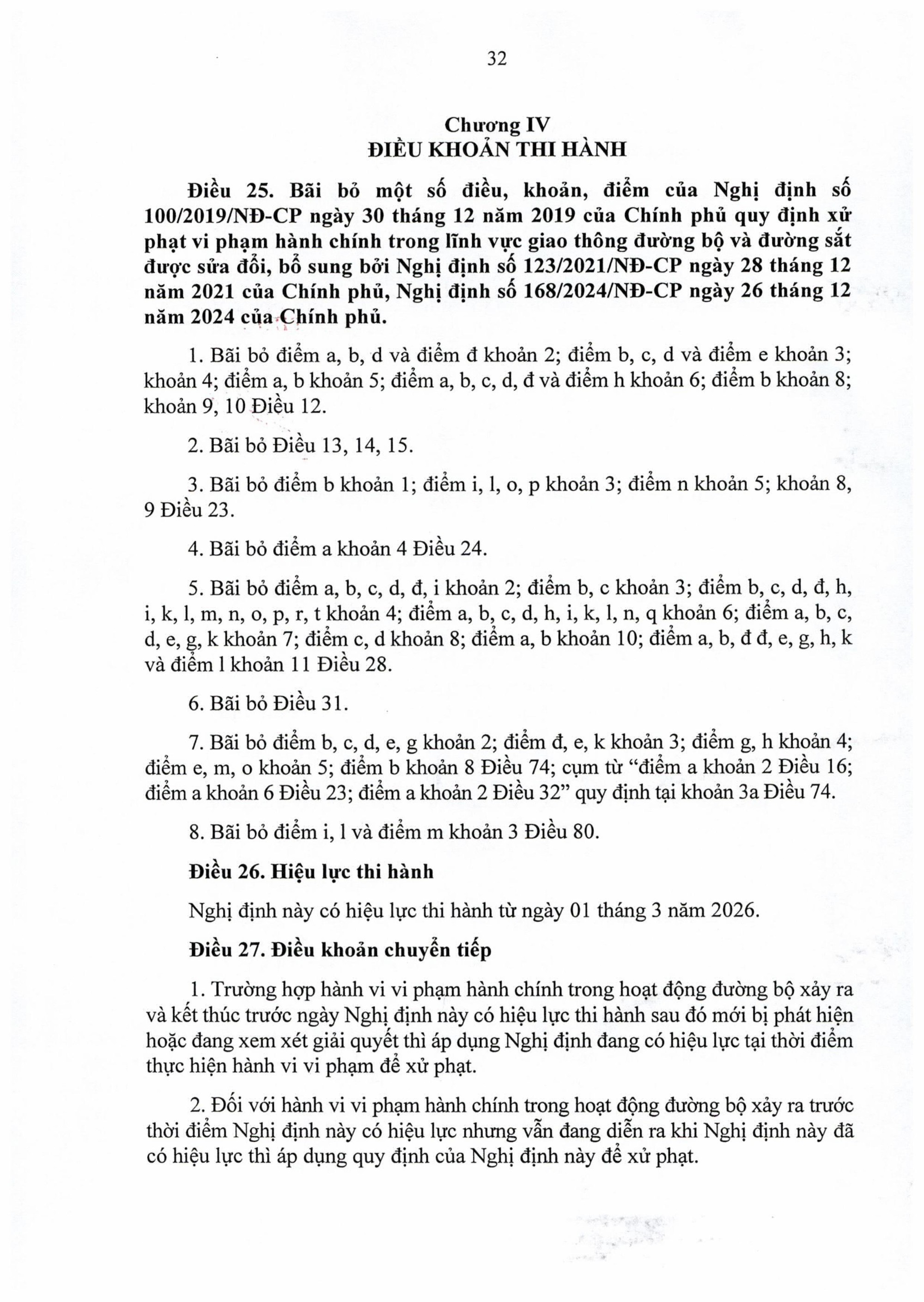 Theo đó, Nghị định số 336/2025/NĐ-CP ngày 22/12/2025 quy định xử phạt vi phạm hành chính trong hoạt động đường bộ bãi bỏ một số điều, khoản, điểm của Nghị định số 100/2019/NĐ-CP quy định xử phạt vi phạm hành chính trong lĩnh vực giao thông đường bộ và đường sắt, được sửa đổi, bổ sung bởi Nghị định số 123/2021/NĐ-CP và Nghị định số 168/2024/NĐ-CP của Chính phủ.