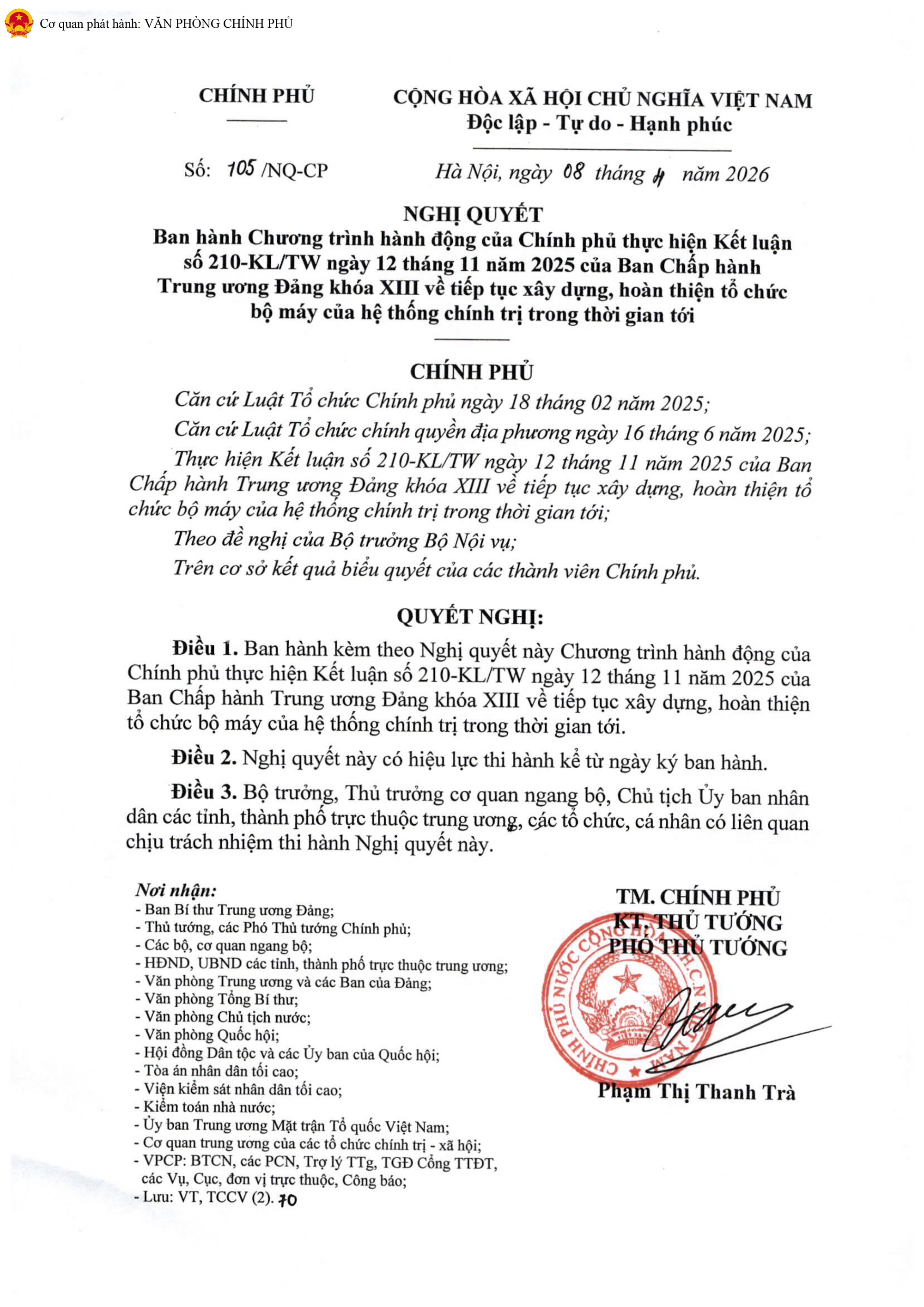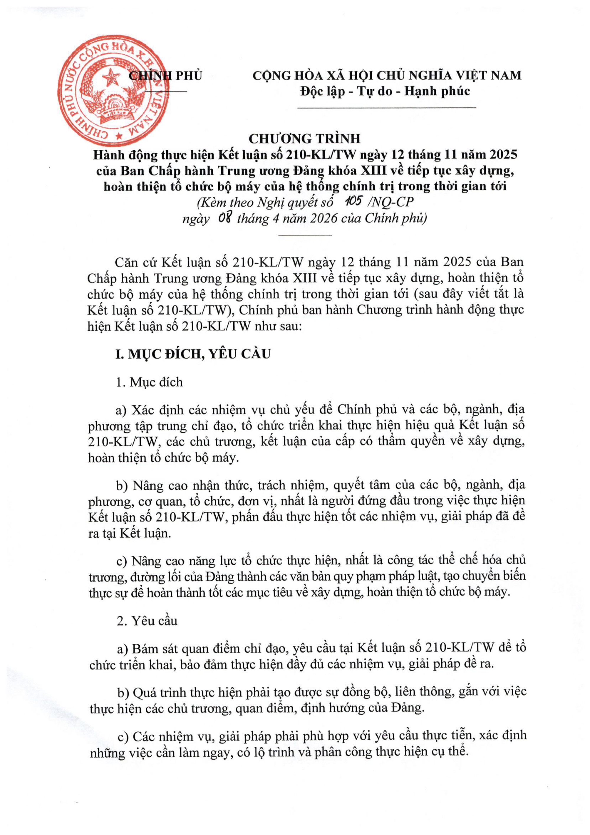 Chính phủ ra Nghị quyết số 105/NQ-CP ngày 08/4/2026 ban hành Chương trình hành động thực hiện Kết luận số 210-KL/TW ngày 12/11/2025 của Ban Chấp hành Trung ương Đảng khóa XIII về tiếp tục xây dựng, hoàn thiện tổ chức bộ máy của hệ thống chính trị trong thời gian tới (Chương trình). Trong đó, Nghị quyết yêu cầu tiếp tục sắp xếp bộ máy theo hướng tinh, gọn, mạnh; sắp xếp thôn, bản, tổ dân phố phù hợp tình hình mới.