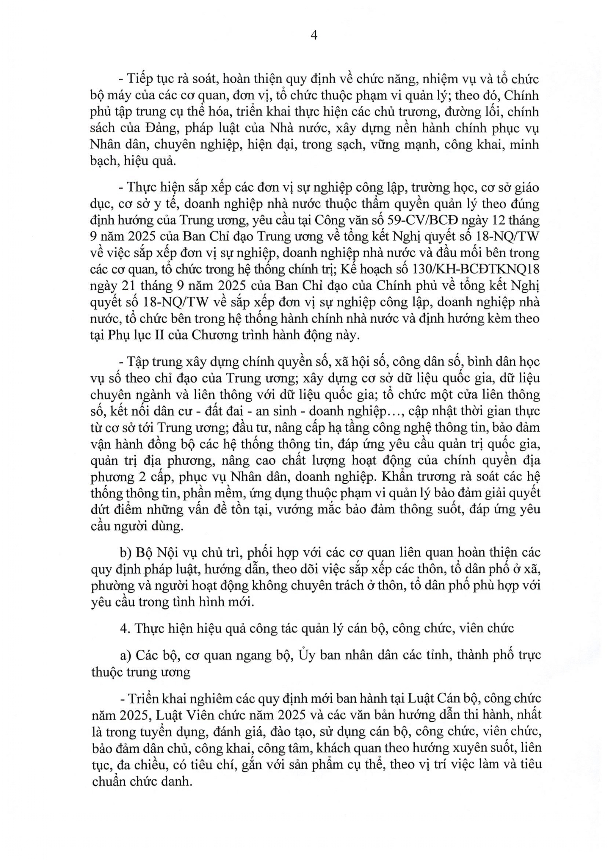 Tập trung xây dựng chính quyền số, xã hội số, công dân số, bình dân học vụ số theo chỉ đạo của Trung ương; xây dựng cơ sở dữ liệu quốc gia, dữ liệu chuyên ngành và liên thông với dữ liệu quốc gia; tổ chức một cửa liên thông số, kết nối dân cư - đất đai - an sinh - doanh nghiệp..., cập nhật thời gian thực từ cơ sở tới Trung ương; đầu tư, nâng cấp hạ tầng công nghệ thông tin, bảo đảm vận hành đồng bộ các hệ thống thông tin, đáp ứng yêu cầu quản trị quốc gia, quản trị địa phương, nâng cao chất lượng hoạt động của chính quyền địa phương 2 cấp, phục vụ Nhân dân, doanh nghiệp.