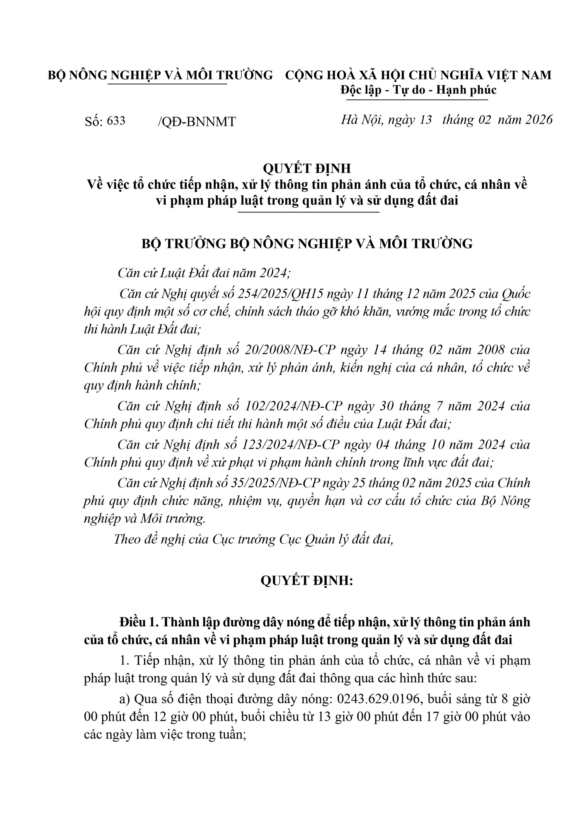 TOÀN VĂN: Quyết định 633/QĐ-BNNMT về việc tổ chức tiếp nhận, xử lý thông tin phản ánh của tổ chức, cá nhân về vi phạm pháp luật trong quản lý và sử dụng đất đai.