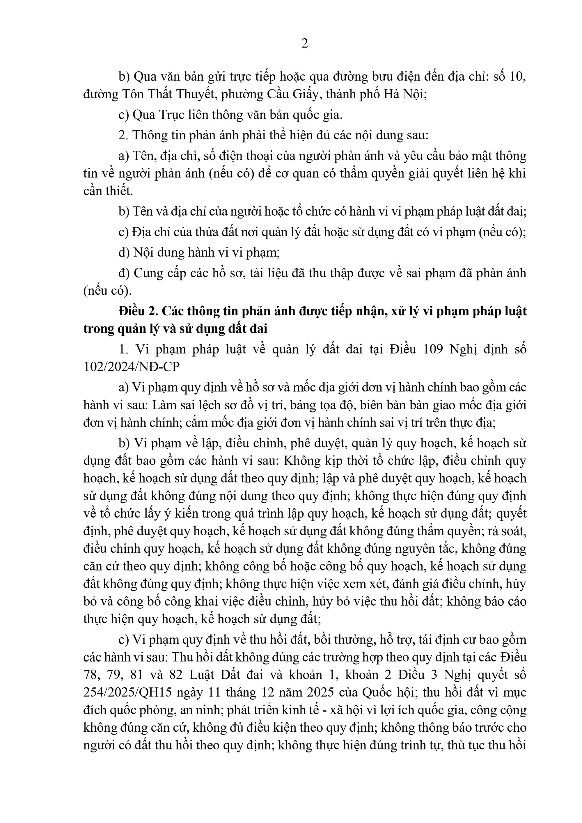 1. Tiếp nhận, xử lý thông tin phản ánh của tổ chức, cá nhân về vi phạm pháp luật trong quản lý và sử dụng đất đai thông qua các hình thức sau: