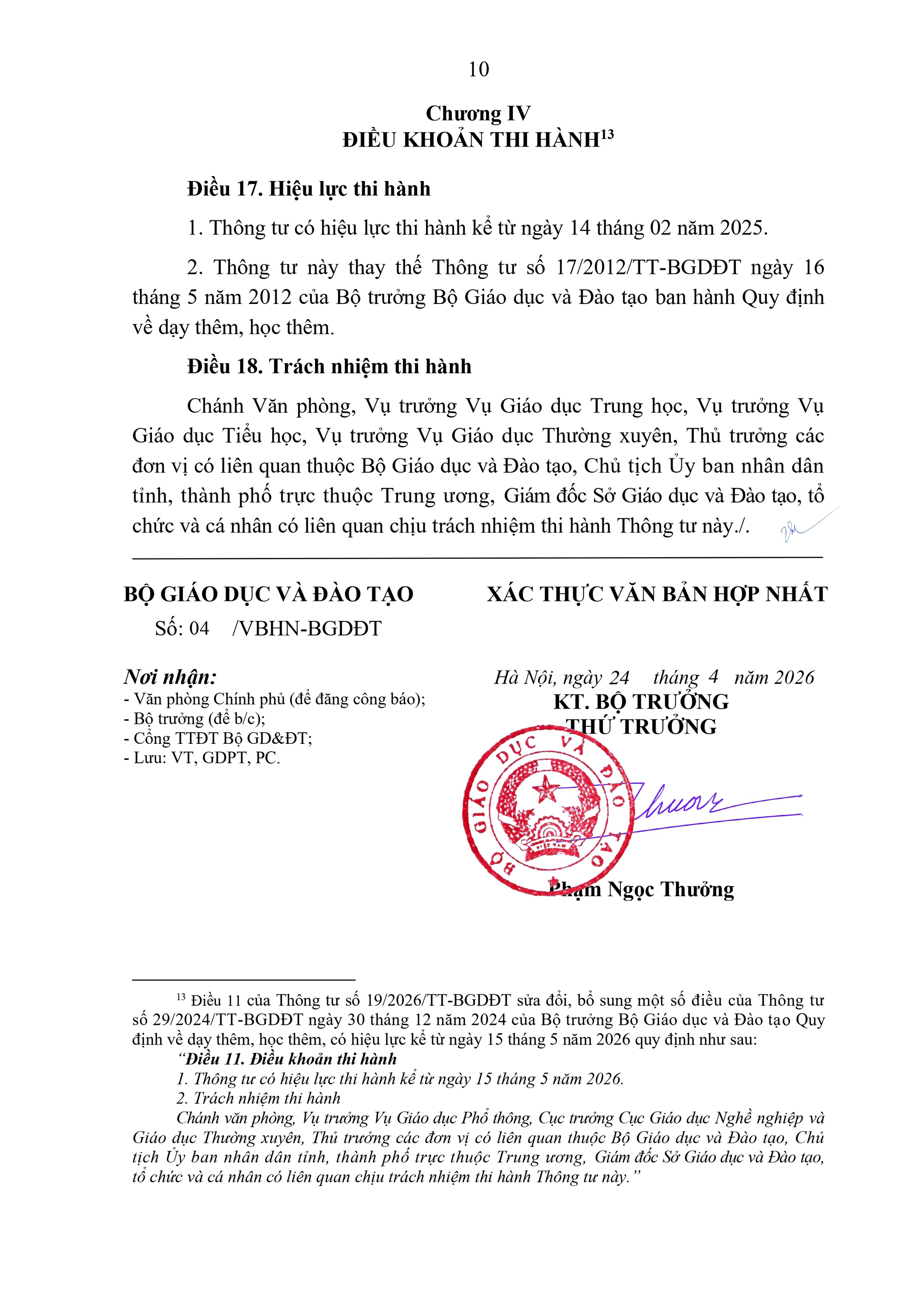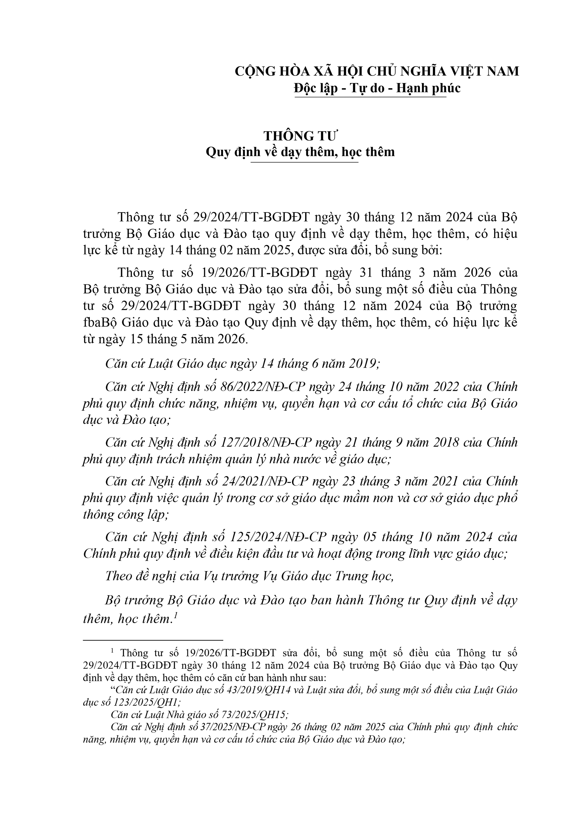 Bộ Giáo dục và Đào tạo ban hành văn bản hợp nhất số 04/VBHN-BGDĐT, ngày 24/4/2026, Thông tư quy định về dạy thêm, học thêm. Văn bản hợp nhất gồm 4 Chương, 18 Điều quy định cụ thể về dạy thêm học thêm.