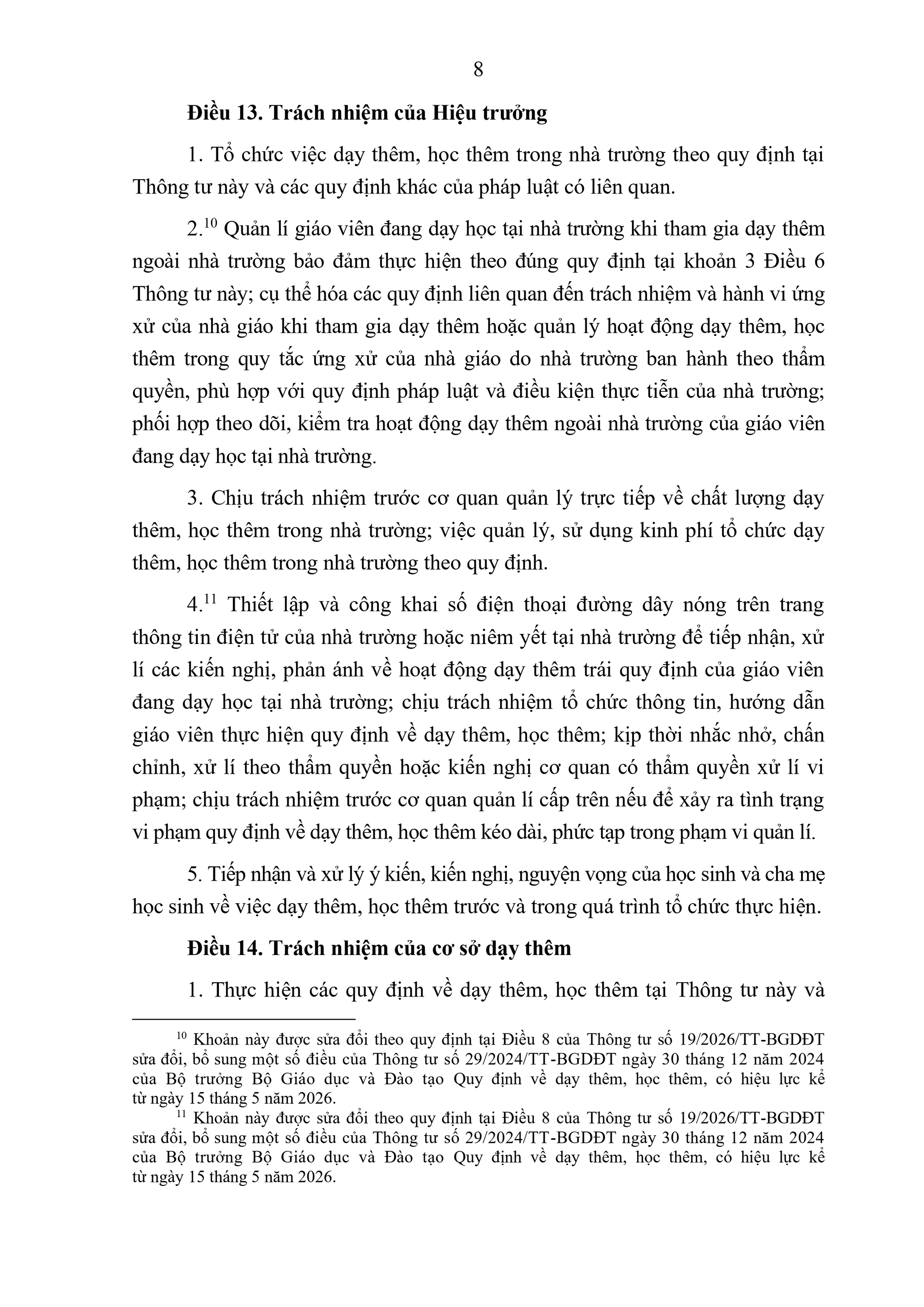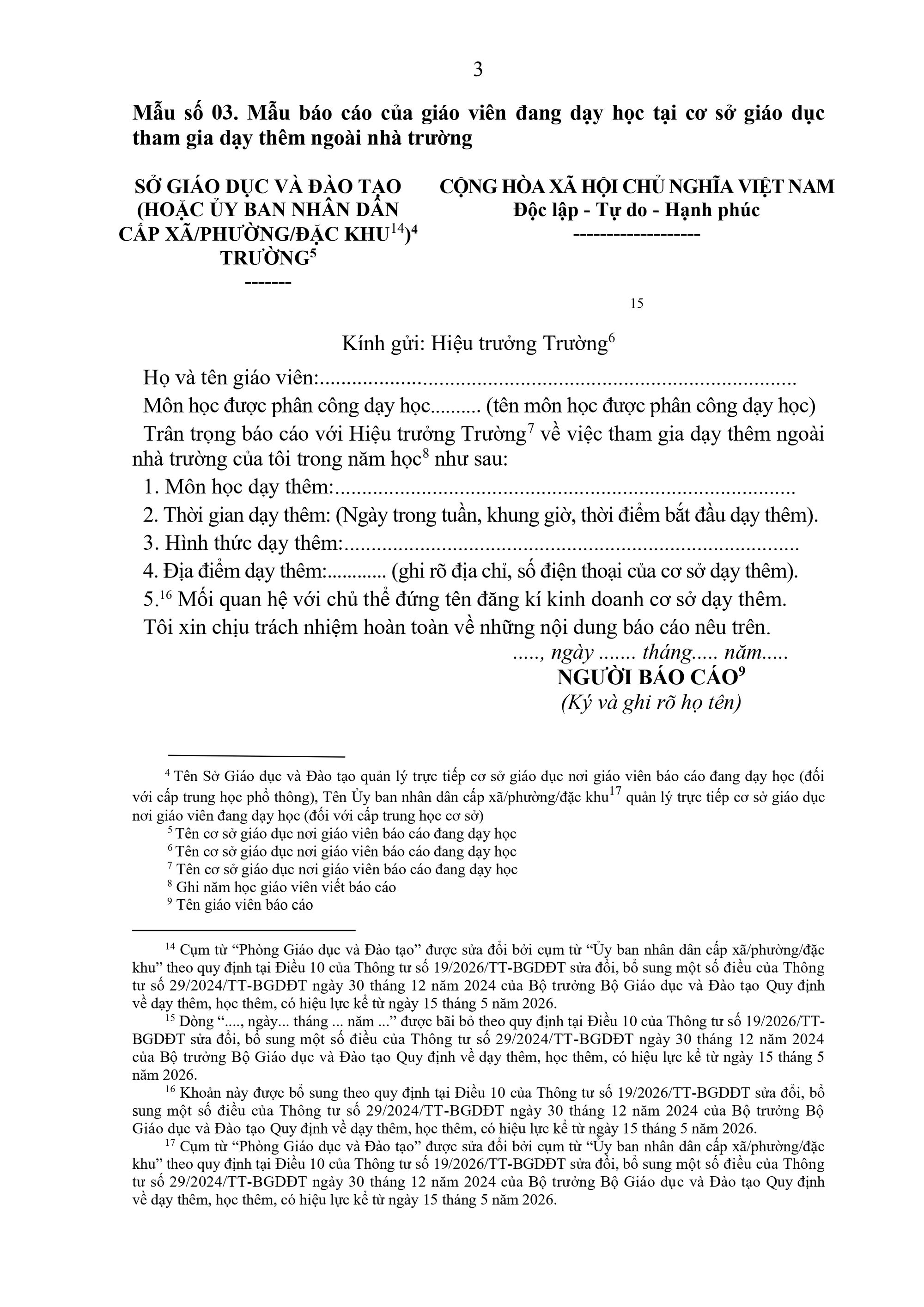 3. Giáo viên đang dạy học tại các nhà trường khi tham gia dạy thêm ngoài nhà trường phải bảo đảm tuân thủ quy tắc ứng xử của nhà giáo theo quy định, có trách nhiệm báo cáo với Hiệu trưởng về môn học, địa điểm, hình thức dạy thêm, mối quan hệ với chủ thể đứng tên đăng kí kinh doanh cơ sở dạy thêm, thời gian tham gia dạy thêm trước khi bắt đầu và cập nhật kịp thời khi có thay đổi đối với các nội dung đã báo cáo, bảo đảm minh bạch, phòng ngừa xung đột lợi ích trong hoạt động dạy thêm.