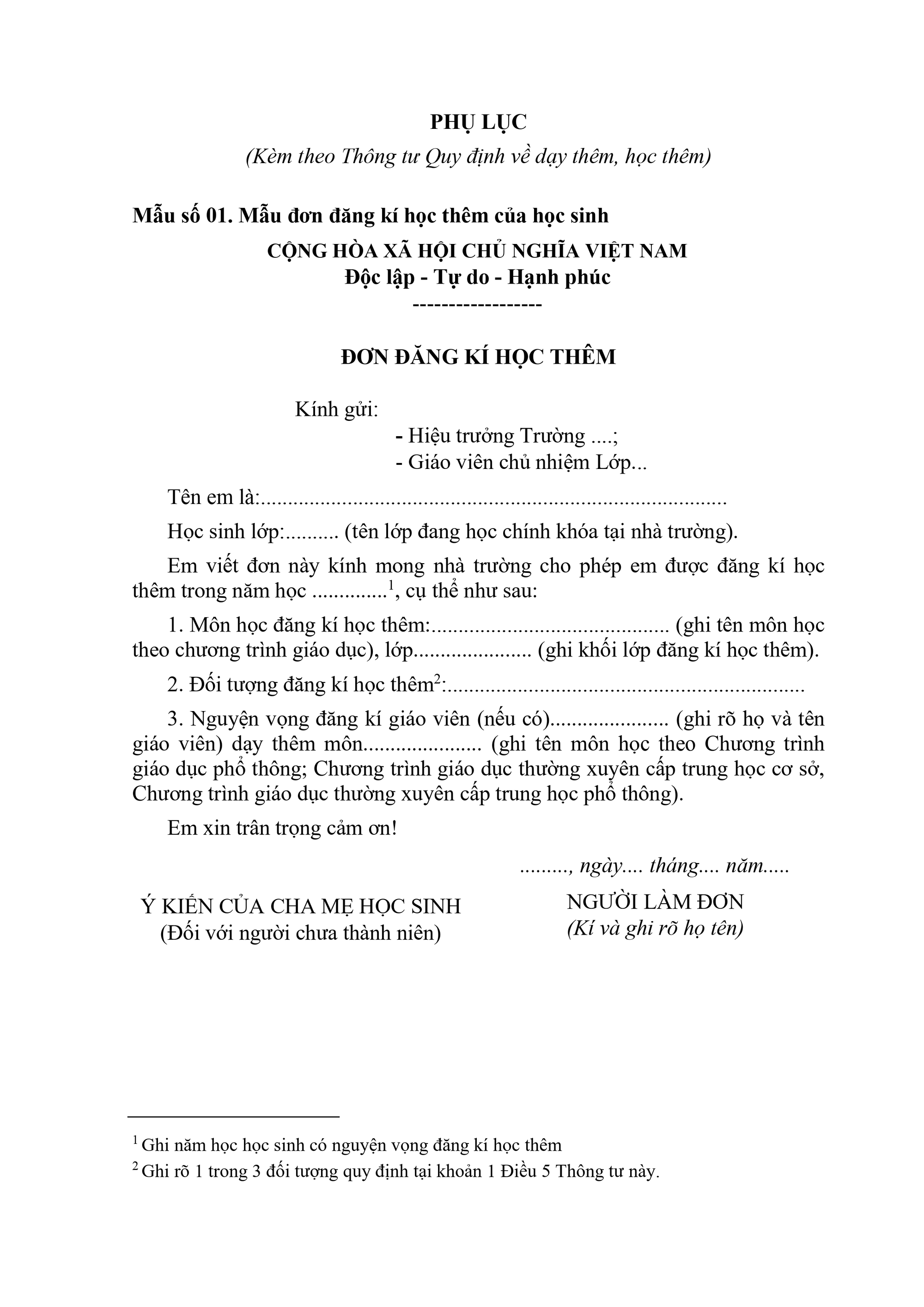 2. Nhà trường tổ chức cho học sinh thuộc đối tượng quy định tại khoản 1 Điều này viết đơn đăng kí học thêm theo từng môn học ở từng khối lớp (theo Mẫu số 01 tại Phụ lục kèm theo Thông tư này).