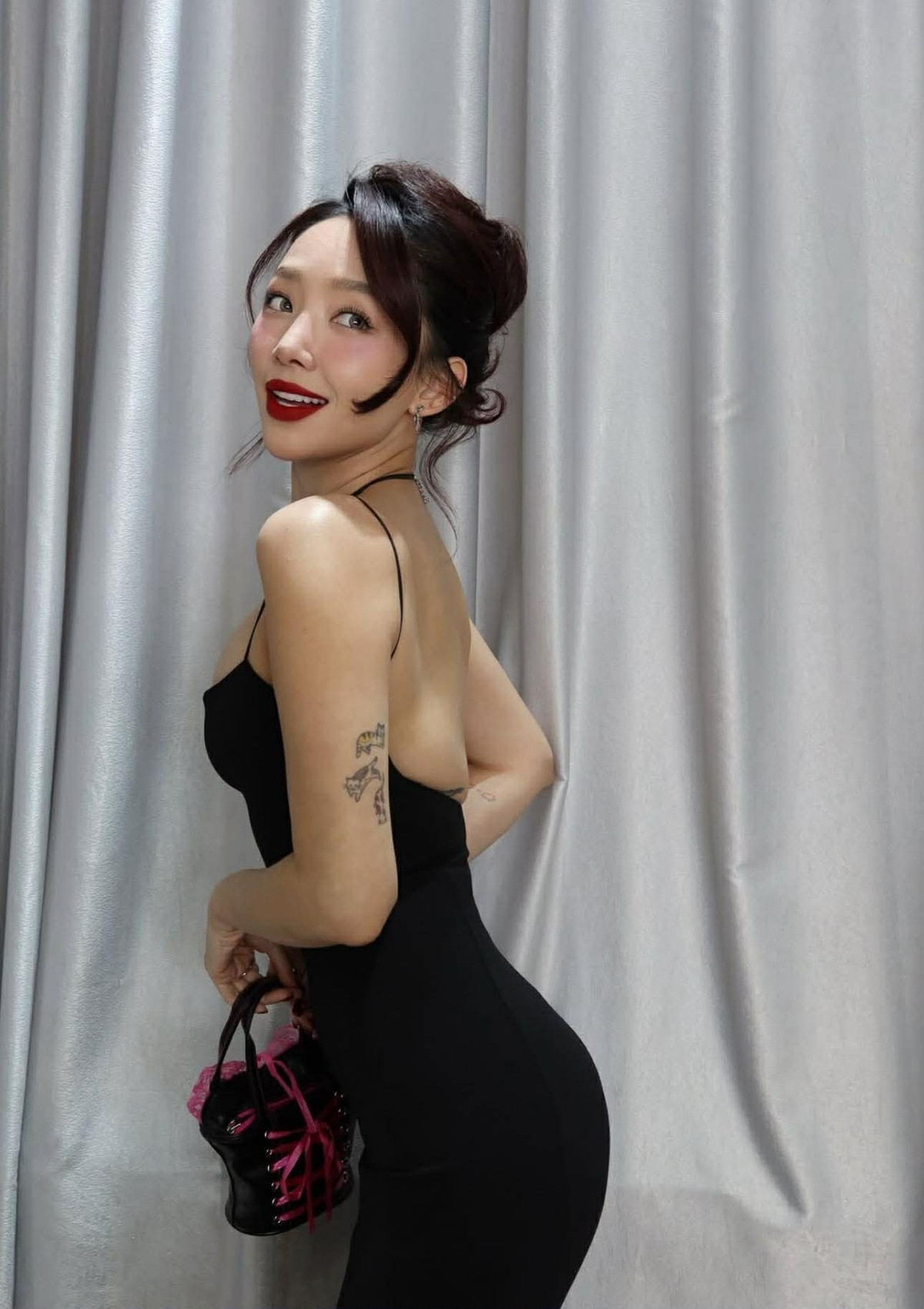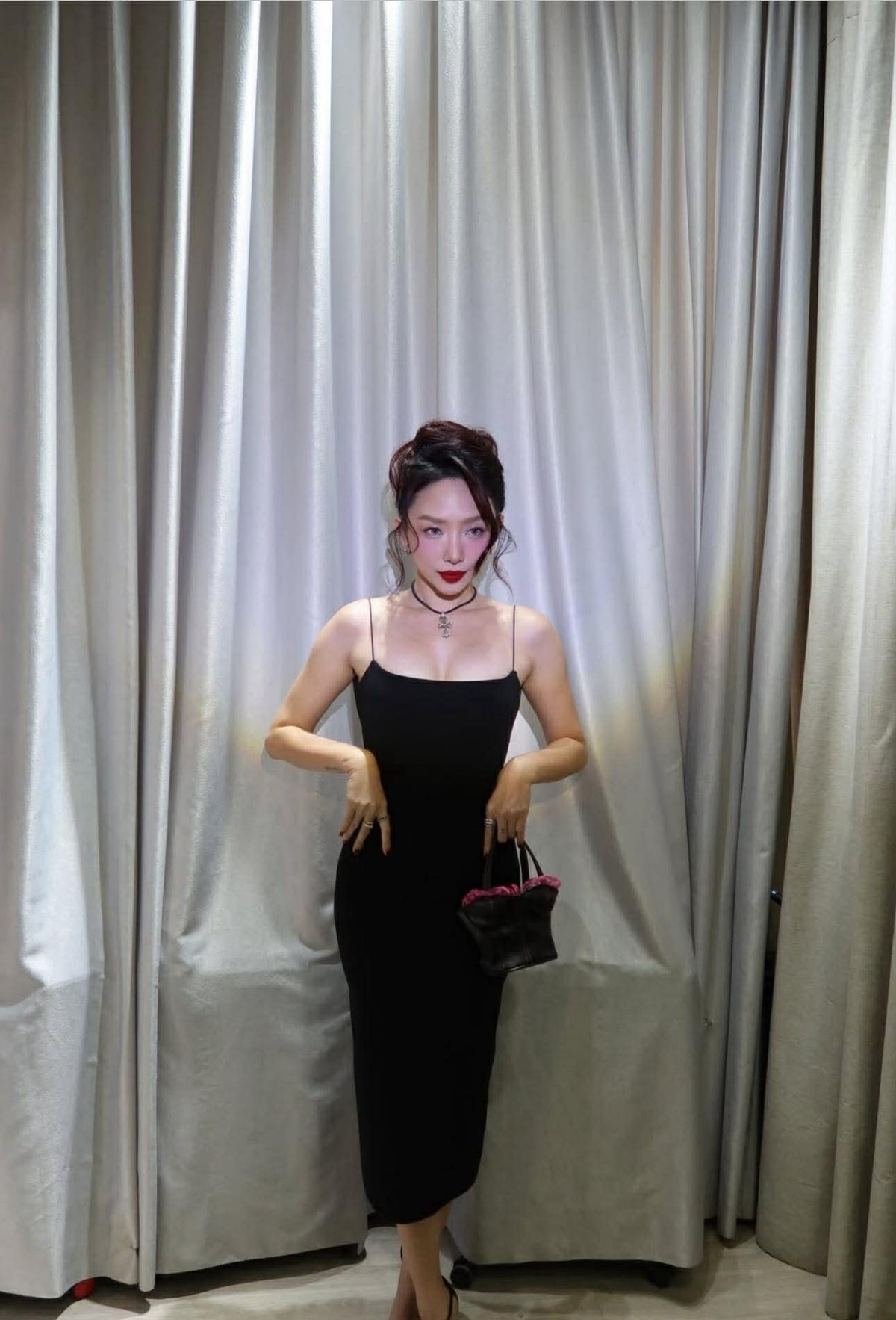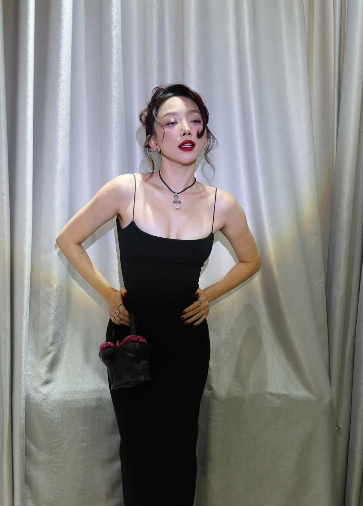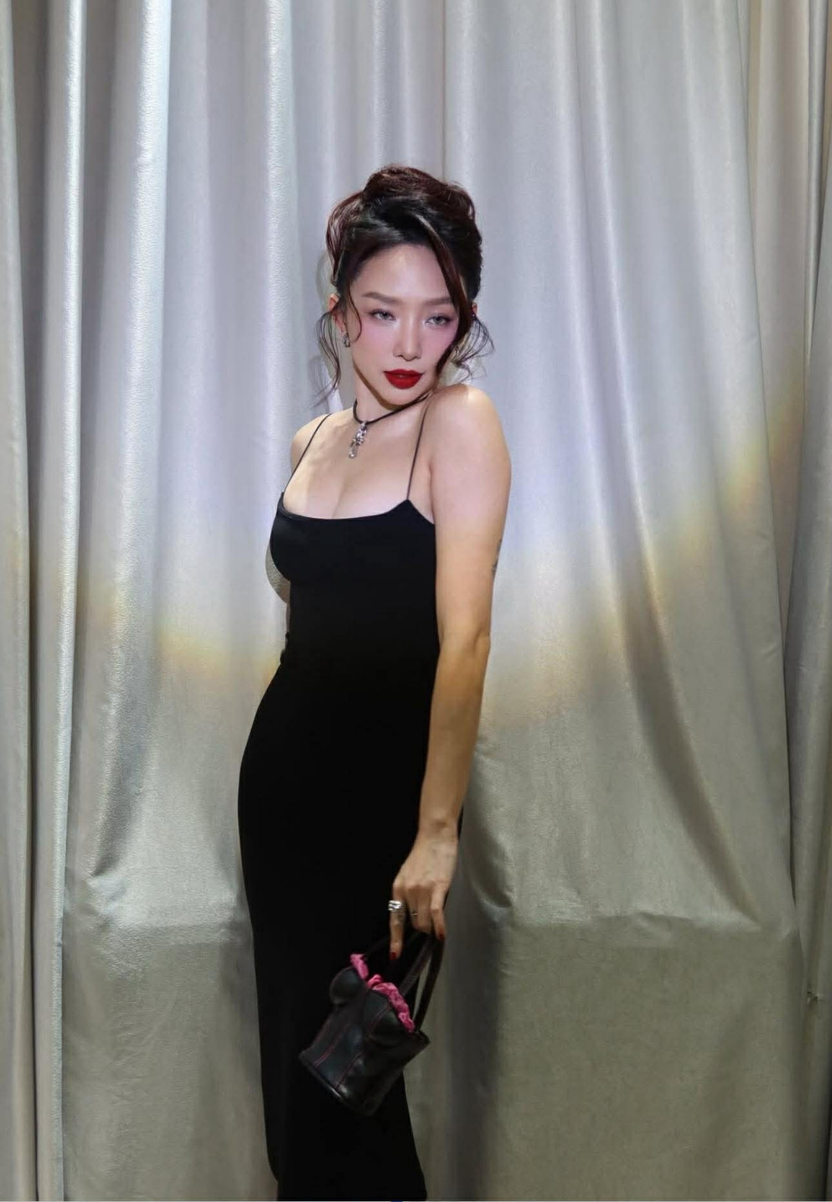 Nữ ca sĩ lựa chọn chiếc đầm đen hai dây có thiết kế hở bạo, khoe bờ vai thon, vòng eo gọn gàng, tấm lưng trần cùng đường cong cơ thể đầy cuốn hút.