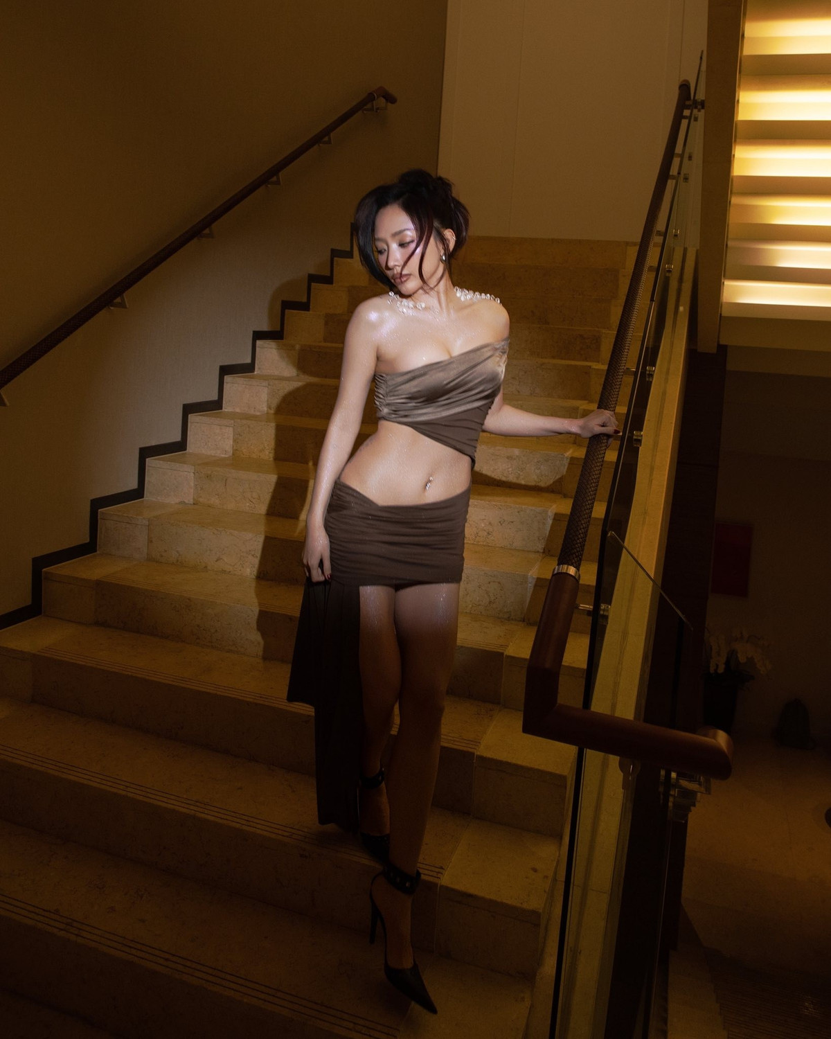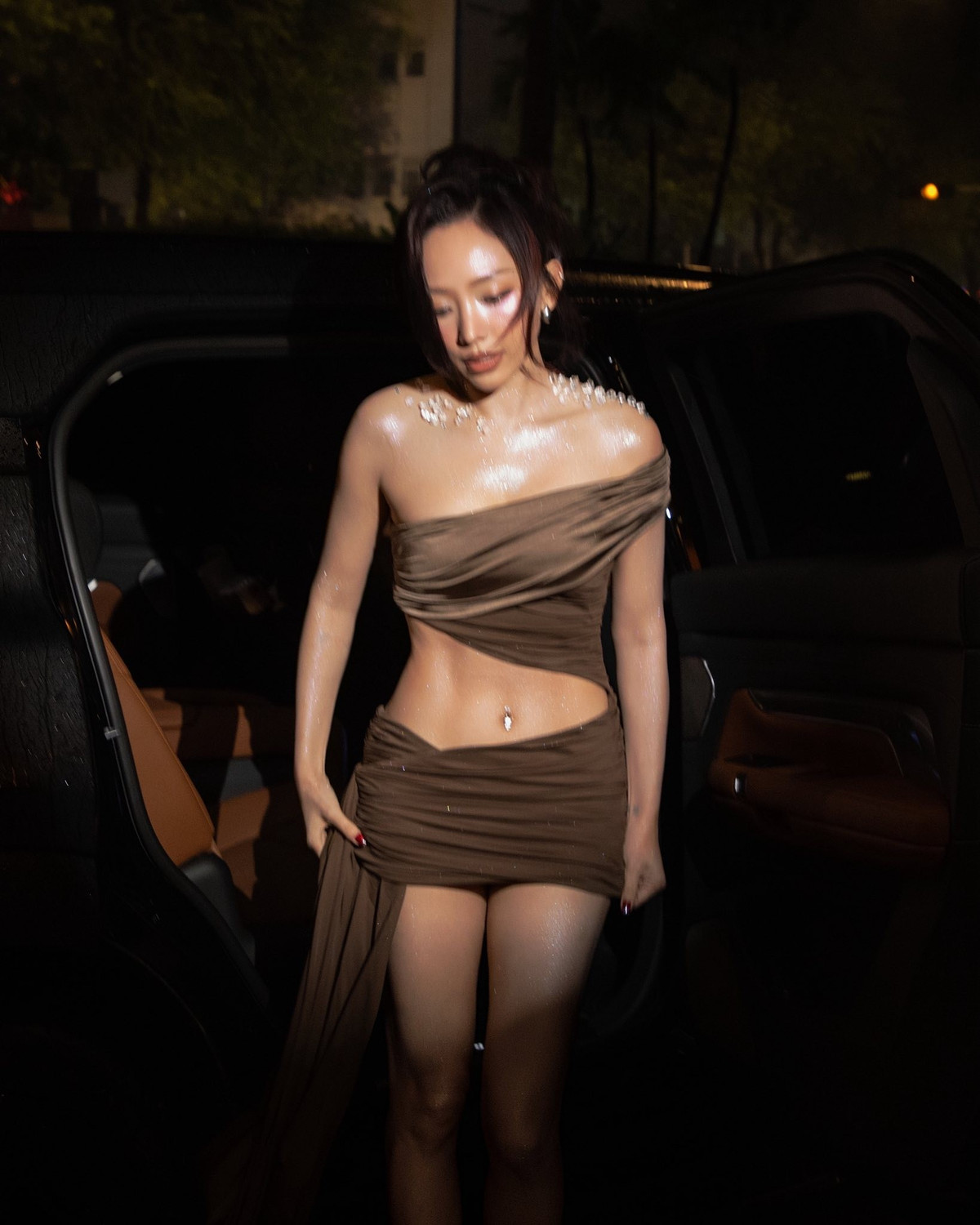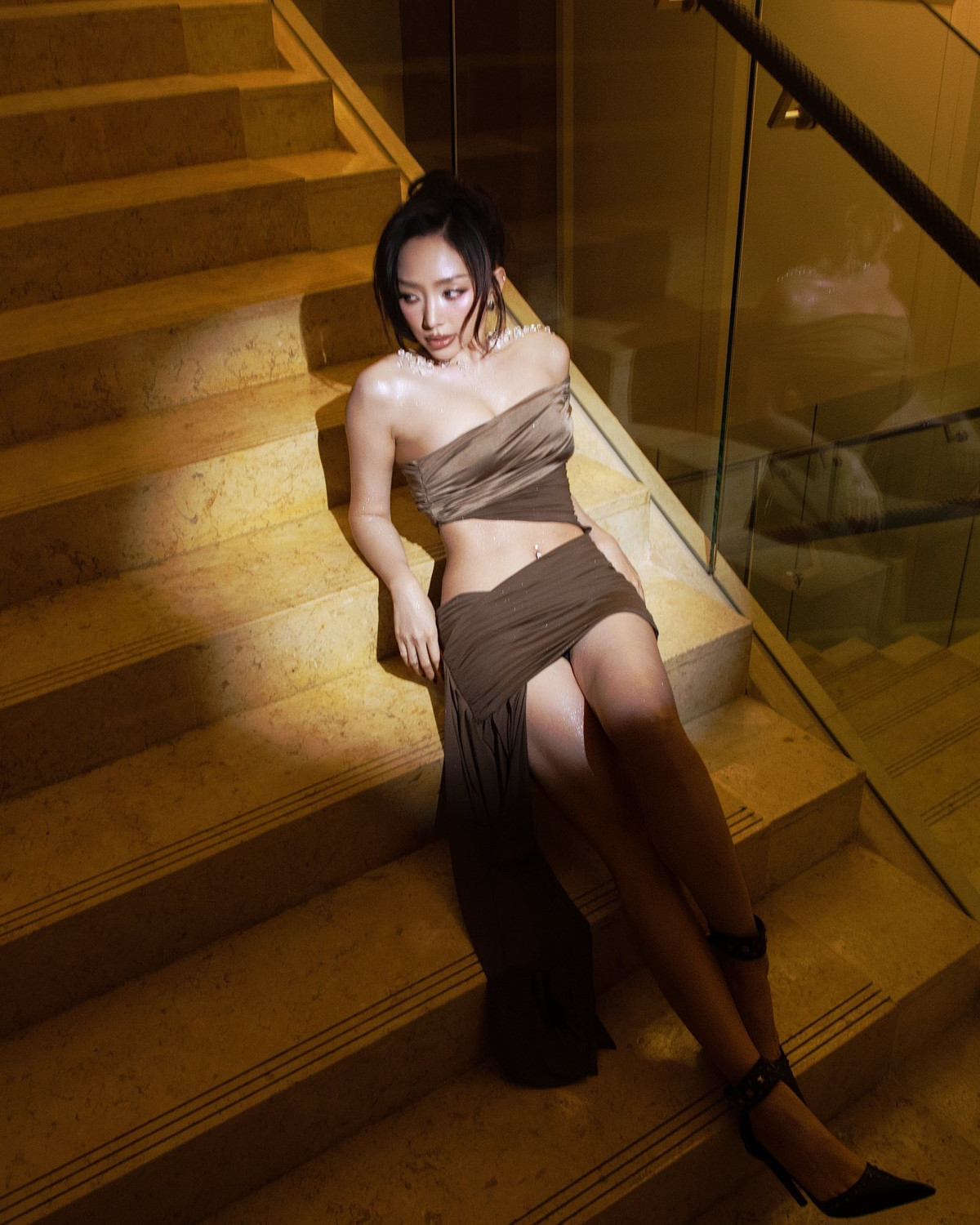 Tóc Tiên mới đây xuất hiện trong bộ váy hai mảnh ôm sát cơ thể được cắt xẻ mạnh tay giúp nữ ca sĩ "flex" vai trần thon thả và vòng eo săn chắc nuột nà