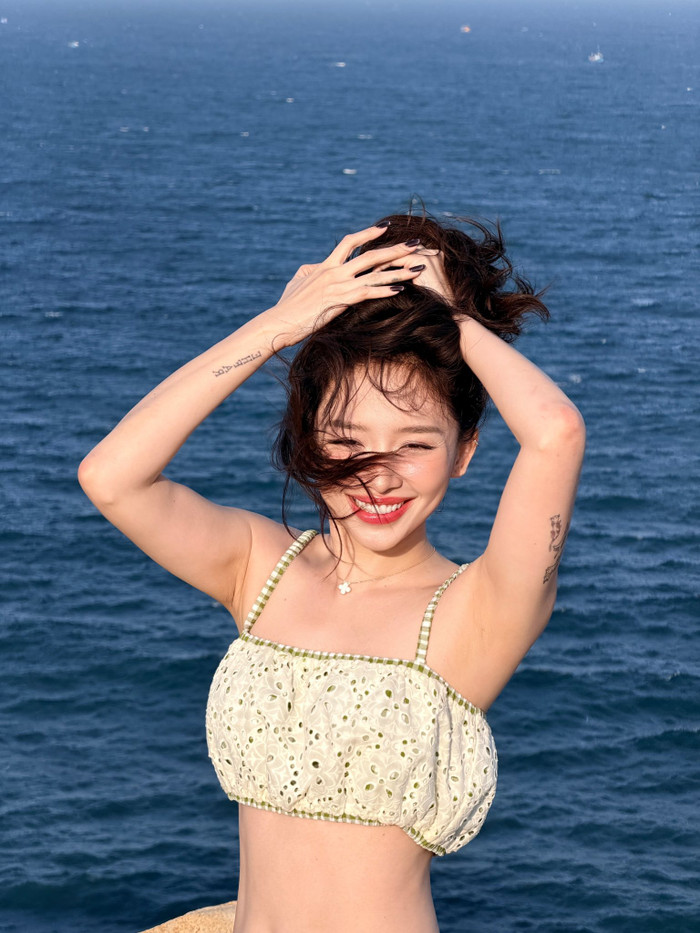 Trong chuyến đi này, Tóc Tiên gây ấn tượng với phong cách trẻ trung, tràn đầy sức sống. Đặc biệt, những khoảnh khắc diện bikini hai mảnh màu xanh dương nổi bật của cô bên bãi biển đầy nắng đã khiến cộng đồng mạng “đứng ngồi không yên”. Nữ ca sĩ tự tin khoe vóc dáng thon thả, vòng eo săn chắc với cơ bụng rõ nét.