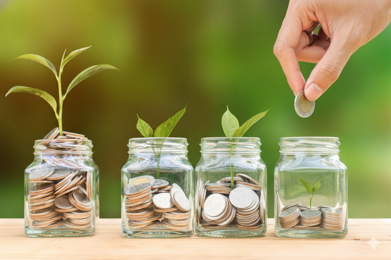 Công thức 4 chiếc hũ: Tiết kiệm, chi tiêu, chia sẻ, đầu tư. (Ảnh minh họa: AI)