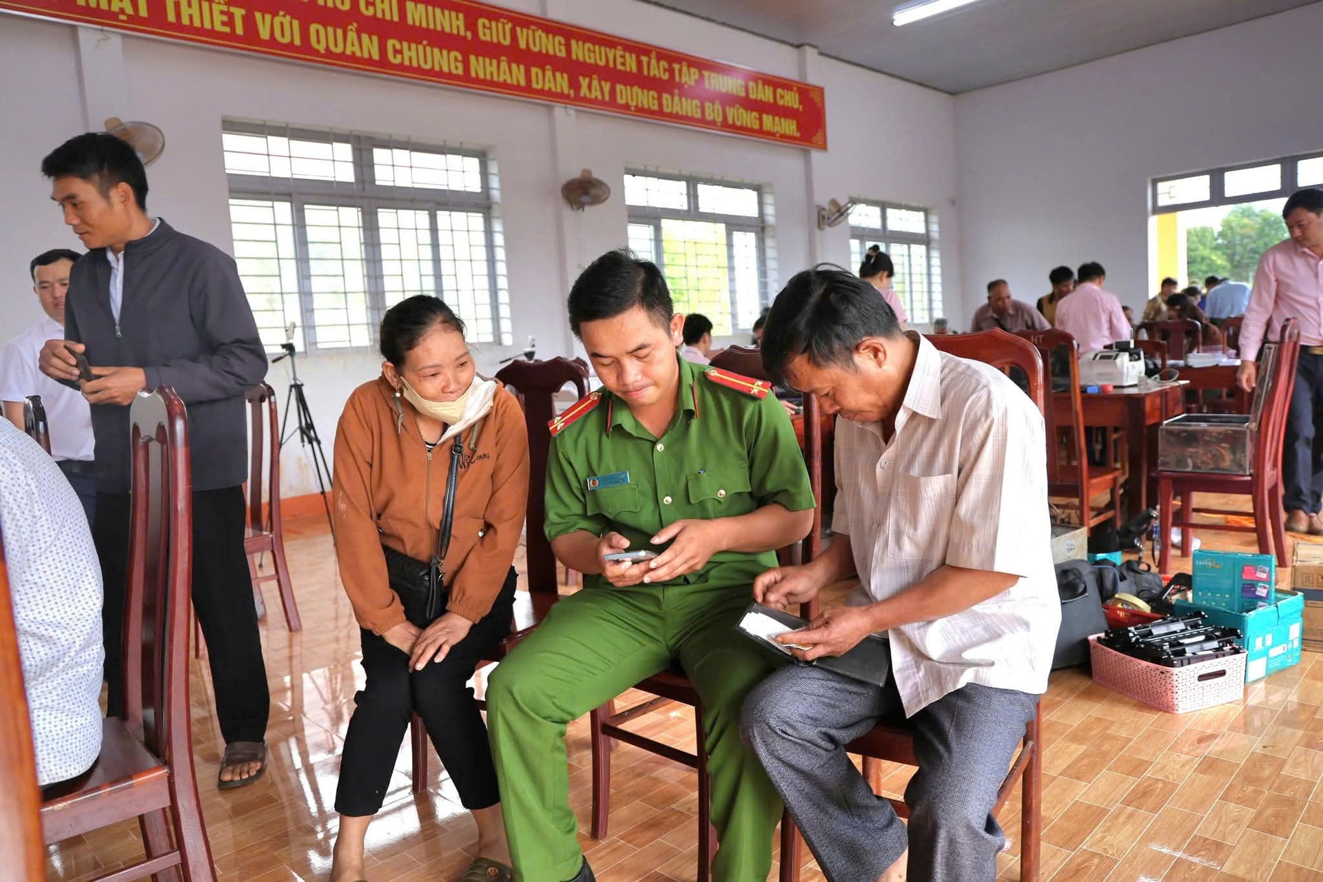 Lực lượng Công an xã hỗ trợ người dân cài đặt tài khoản định danh mức độ 2. Ảnh: Hoàng Hoài