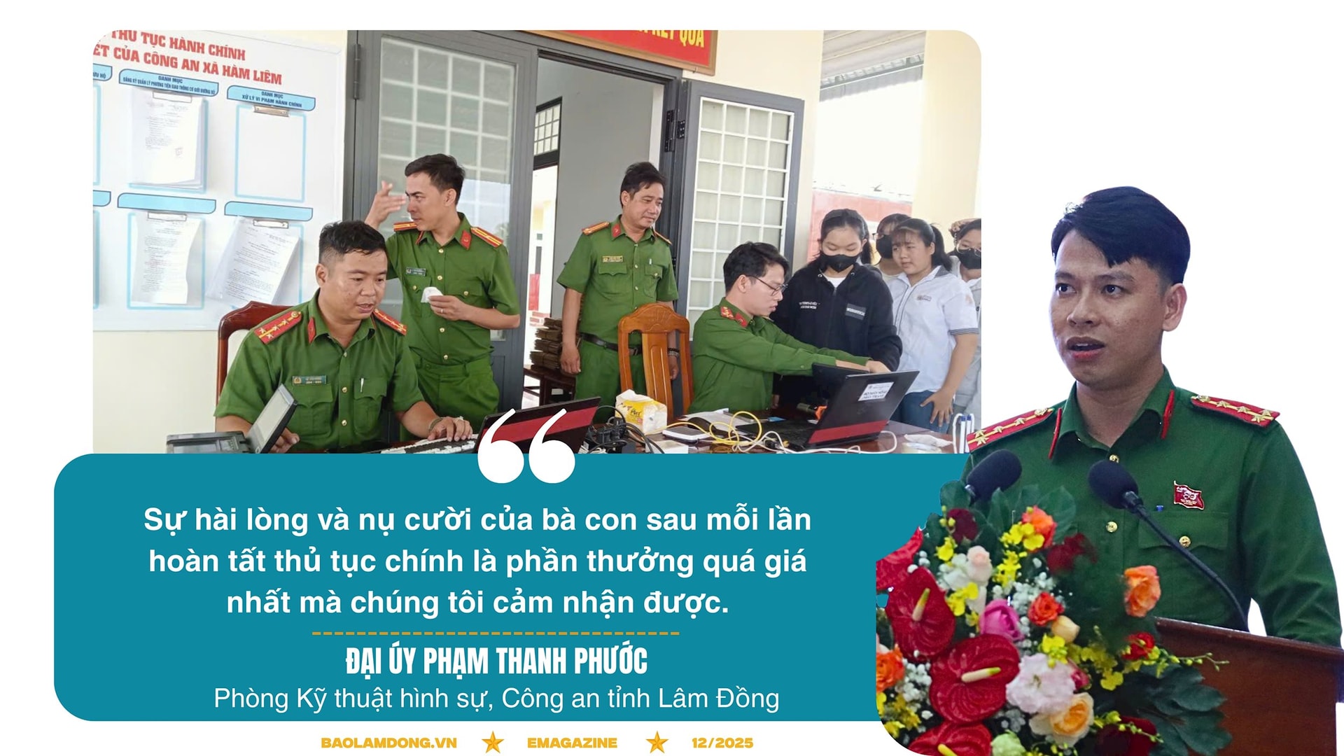 “Tôi cùng Công an xã Hàm Liêm trực tiếp hỗ trợ người dân thực hiện đầy đủ thủ tục hành chính như đăng ký, quản lý cư trú và cập nhật dữ liệu dân cư. Nhiều trường hợp thông tin bị sai sót, bị xóa dữ liệu, chúng tôi hướng dẫn chi tiết để người dân khôi phục chính xác. Sự hài lòng và nụ cười của bà con sau mỗi lần hoàn tất thủ tục chính là phần thưởng quý giá nhất dành cho chúng tôi”, Đại úy Phước chia sẻ.