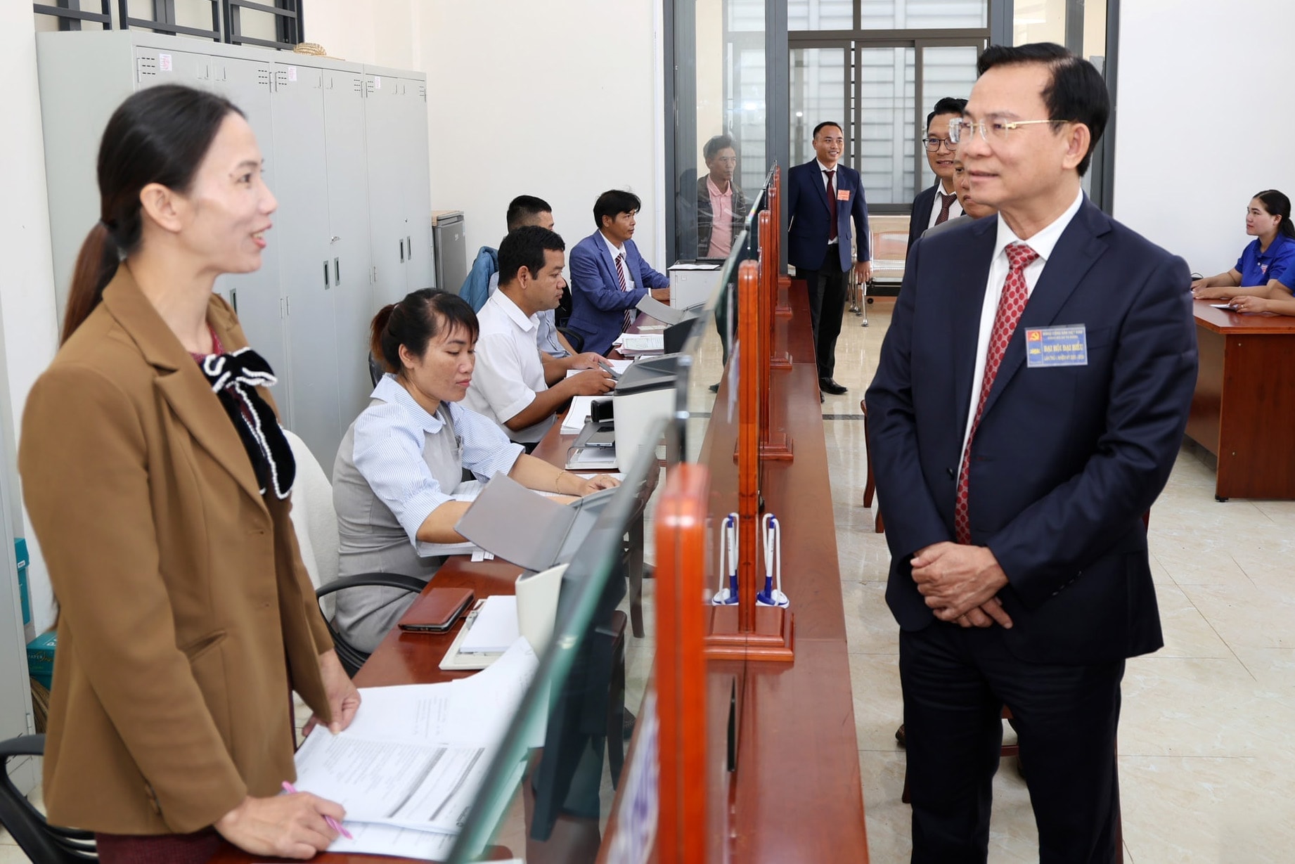 Lãnh đạo Tỉnh ủy thăm hỏi, động viên các cán bộ tham gia hỗ trợ người dân khi đến giao dịch tại Trung tâm Phục vụ hành chính công xã Đam Rông 3