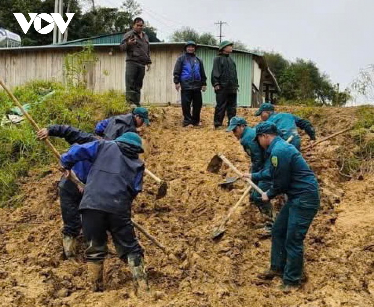 Các lực lượngdọn đất đá, khơi thông tuyến đường lên cửa khẩu phụ Tây Giang – Kà Lừm Dự kiến tối nay 23/10 các lực lượng sẽ hoàn tất công tác khắc phục, đảm bảo thông tuyến bước đầu.