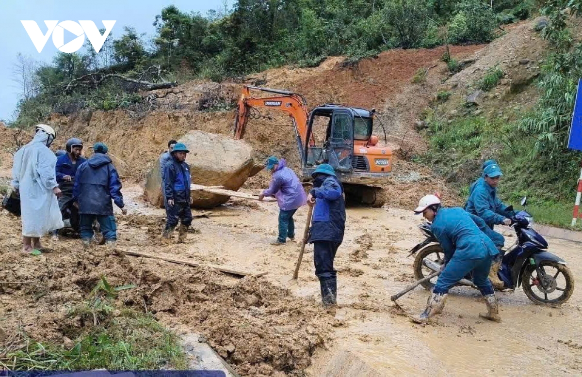 Các lực lượng trương thu dọn đất đá, khơi thông tuyến đường