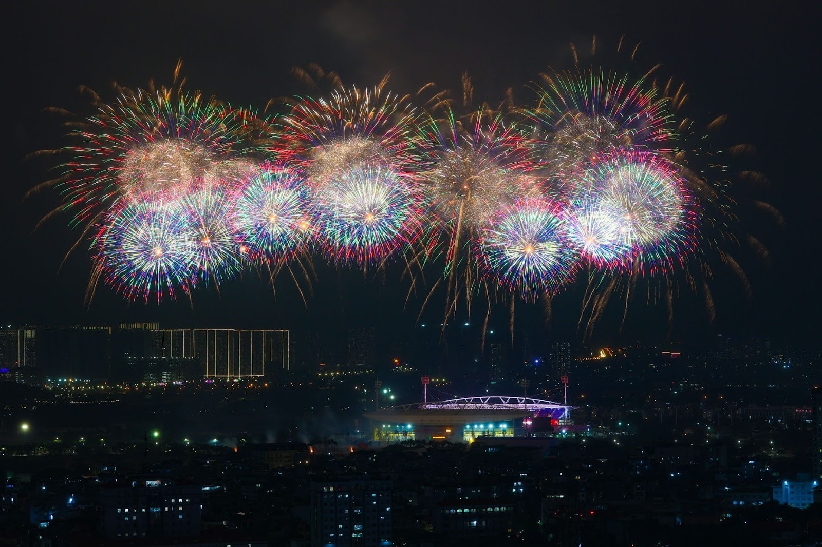 Tập đoàn Sun Group đã phối hợp chặt chẽ cùng Bộ Tư lệnh Thủ đô và Công ty TNHH Một thành viên Hóa chất 21 (Z121) để xây dựng, triển khai trận địa pháo hoa tại khu vực SVĐ quốc gia Mỹ Đình. Trong đó, 950 giàn phun pháo hoa và 4.400 ống pháo hoa hỏa thuật được lắp đặt trực tiếp trên mái nhà và hai bên cánh khán đài B theo địa hình vòng cung. Bên ngoài sân là trận địa 4.600 pháo hoa nổ tầm cao được bố trí từ nửa đường Lê Đức Thọ qua cột đồng hồ đến bãi đất trống trước Cung thể thao dưới nước, phường Từ Liêm.