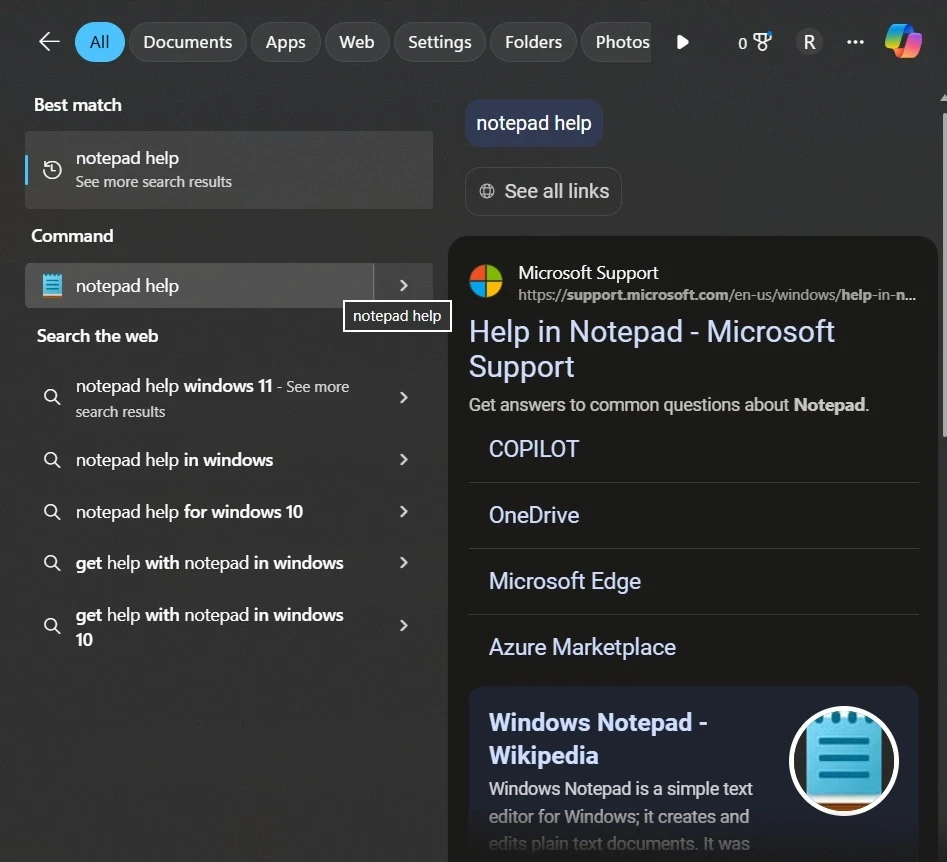 Cách nhanh nhất để tìm câu trả lời là sử dụng thanh tìm kiếm bên cạnh nút Start. Bằng cách gõ các từ khóa như “Notepad help” hoặc “Notepad settings”, hệ thống sẽ hiển thị các gợi ý từ tài liệu hướng dẫn hoặc liên kết trực tuyến chính thống.