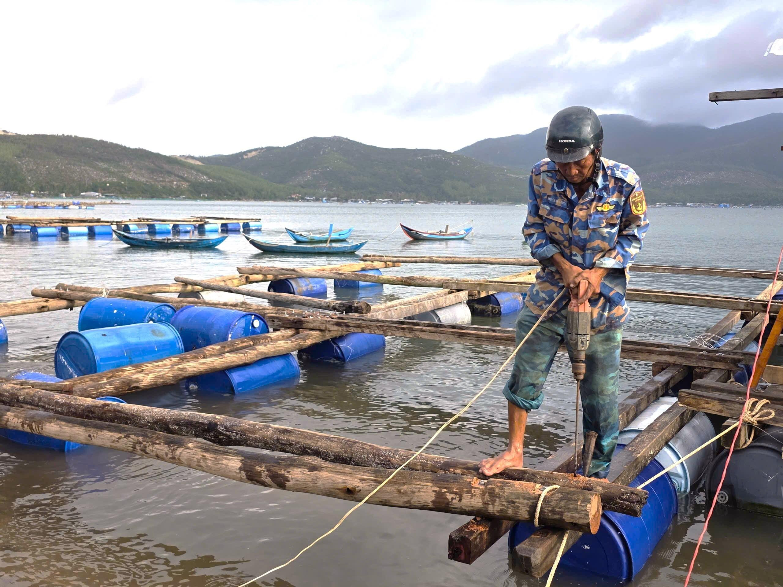 Theo ông Hải, ông đang sửa lại 2 bè với 10 ô lồng nuôi. "May còn tận dụng được lồng cũ nên chi phí giảm một nửa, chứ đóng mới thì rất tốn kém khi giá vật tư tăng hơi trước rất nhiều. Công thợ bây giờ cũng cao, khoảng 500.000 đồng/người/ngày” - ông Hải nói.
