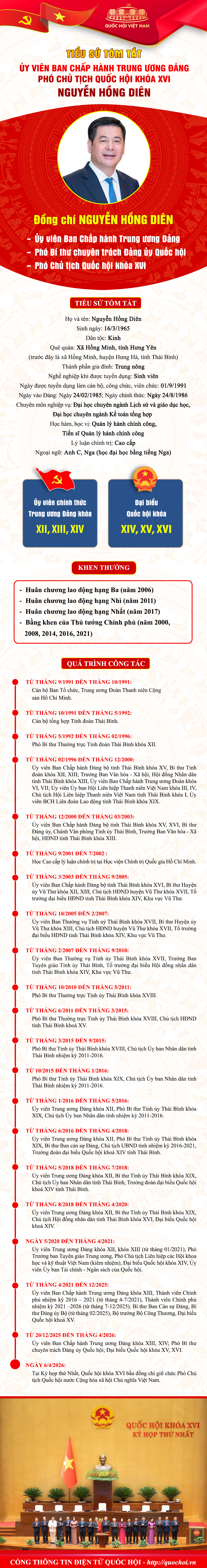 Cổng Thông tin điện tử Chính phủ giới thiệu Tiểu sử tóm tắt Phó Chủ tịch Quốc hội Nguyễn Hồng Diên.