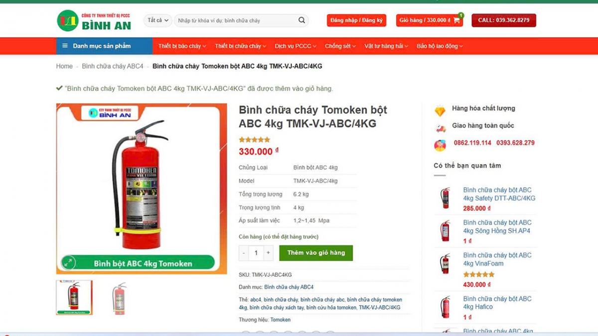 Các trang này chuyên cung cấp bình chữa cháy, thiết bị PCCC và bảo hộ lao động, quảng cáo nguồn gốc rõ ràng, đạt tiêu chuẩn kiểm định an toàn. Giá sản phẩm dao động 470 nghìn – 6,980 nghìn đồng mỗi bình. Thậm chí trên trang website nhatthuc.com.vn còn có bảng so sánh ưu nhược điểm, trong đó ưu điểm của sản phẩm này được quảng cáo là khả năng dập tắt hiệu quả đám cháy lớp A (chất rắn), lớp B (chất lỏng dễ cháy) và lớp C (khí dễ cháy).
