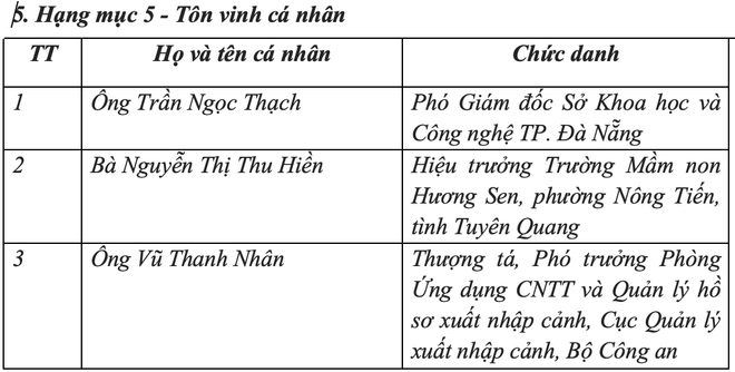 Điểm nhấn nổi bật của VDA 2025 là việc lần đầu tiên bổ sung hạng mục vinh danh cá nhân, nhằm tôn vinh những gương mặt có đóng góp lớn cho công cuộc chuyển đổi số quốc gia. Các cá nhân tiêu biểu được trao giải năm nay là những người đã có công trình, sáng kiến và hoạt động nổi bật, thể hiện rõ vai trò "con người là trung tâm của chuyển đổi số."