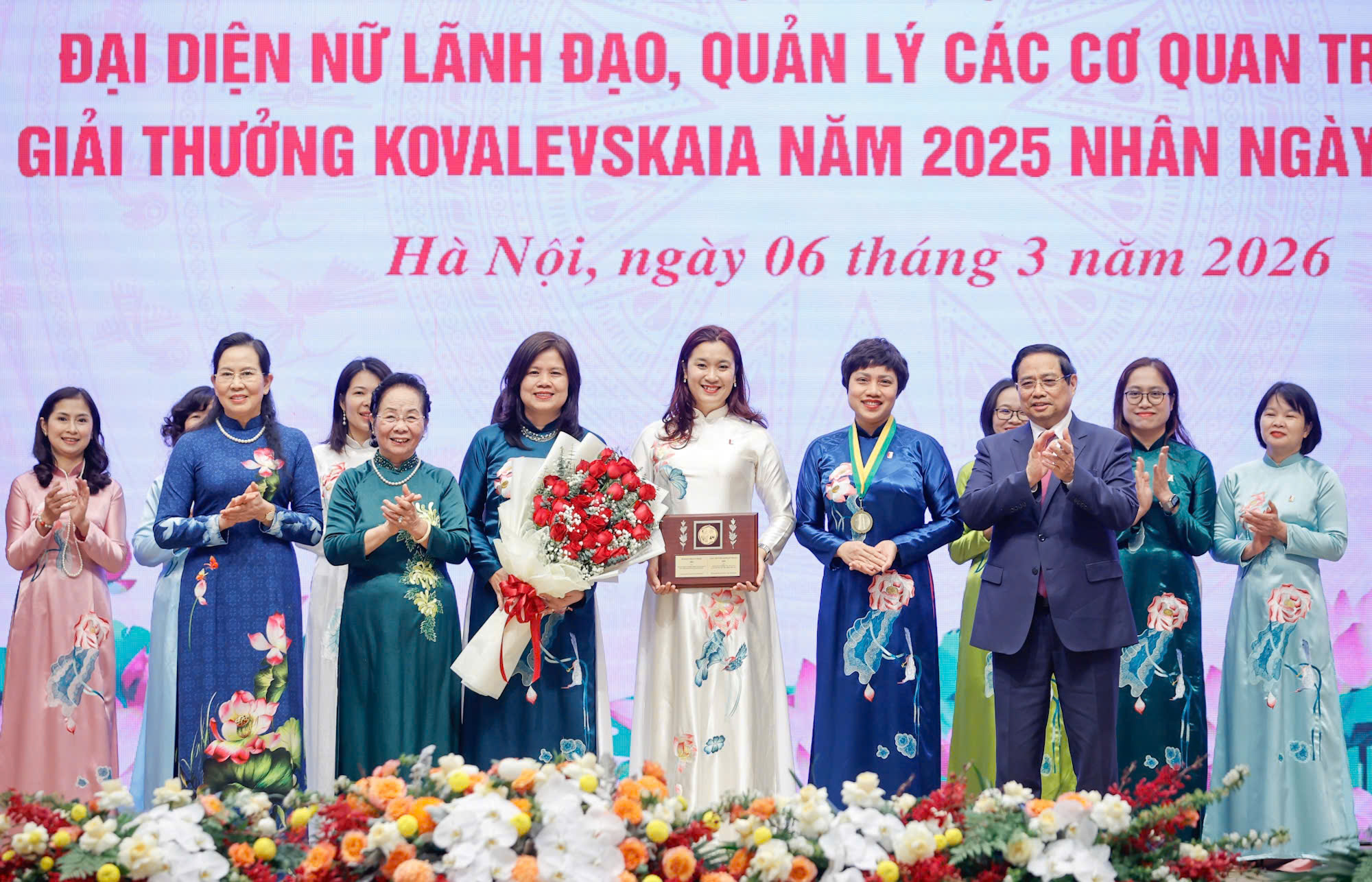 Thủ tướng Phạm Minh Chính gặp mặt nữ lãnh đạo, quản lý các cơ quan Trung ương và trao giải thưởng Kovalevskaia năm 2025, sáng 6-3. Ảnh VIẾT CHUNG