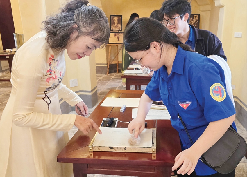 Các em học sinh trải nghiệm in mộc bản hoa văn Triều Nguyễn