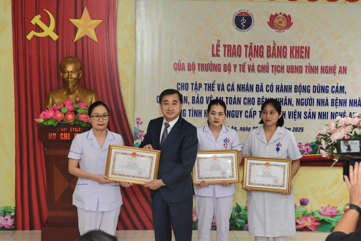 Thay mặt lãnh đạo Bộ Y tế, Thứ trưởng Trần Văn Thuấn đã trao tặng bằng khen của Bộ trưởng Bộ Y tế cho 1 tập thể và 4 cá nhân thuộc Bệnh viện Sản Nhi Nghệ An vì đã có hành động dũng cảm, mưu trí, không quản nguy hiểm để bảo vệ tính mạng, sức khỏe của người bệnh và người nhà bệnh nhân, bao gồm: tập thể khoa Sơ sinh; điều dưỡng Nguyễn Thùy Trang; Nguyễn Thị Thu Hoài, Trần Thị Hồng và Nguyễn Thị Hồng.