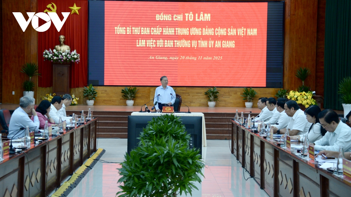 Phát biểu tại buổi làm việc, Tổng Bí thư Tô Lâm biểu dương những kết quả rất đáng trân trọng của tỉnh đã đạt được trong thời gian qua, tuy nhiên, cũng lưu ý giai đoạn tới đối với tỉnh An Giang sẽ là giai đoạn vừa mở ra nhiều cơ hội phát triển mới, nhất là sau hợp nhất đơn vị hành chính, mở rộng không gian kinh tế biển, biên giới nhưng cũng đứng trước không ít khó khăn, thách thức về hạ tầng, môi trường, an sinh xã hội, xây dựng bộ máy chính quyền hai cấp, nhất là yêu cầu tăng trưởng nhanh và bền vững, cũng như sức ép cạnh tranh ngày càng lớn trong vùng.