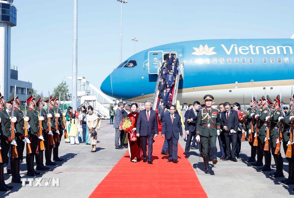 Lễ đón Tổng Bí thư Tô Lâm và Phu nhân tại sân bay quốc tế Wattay, thủ đô Vientiane. (Ảnh: Thống Nhất/TTXVN)