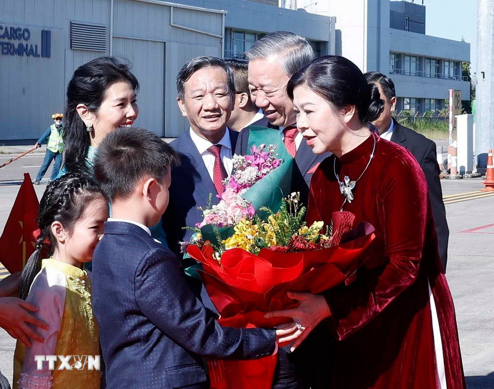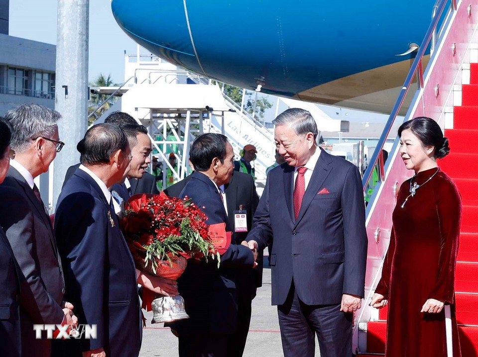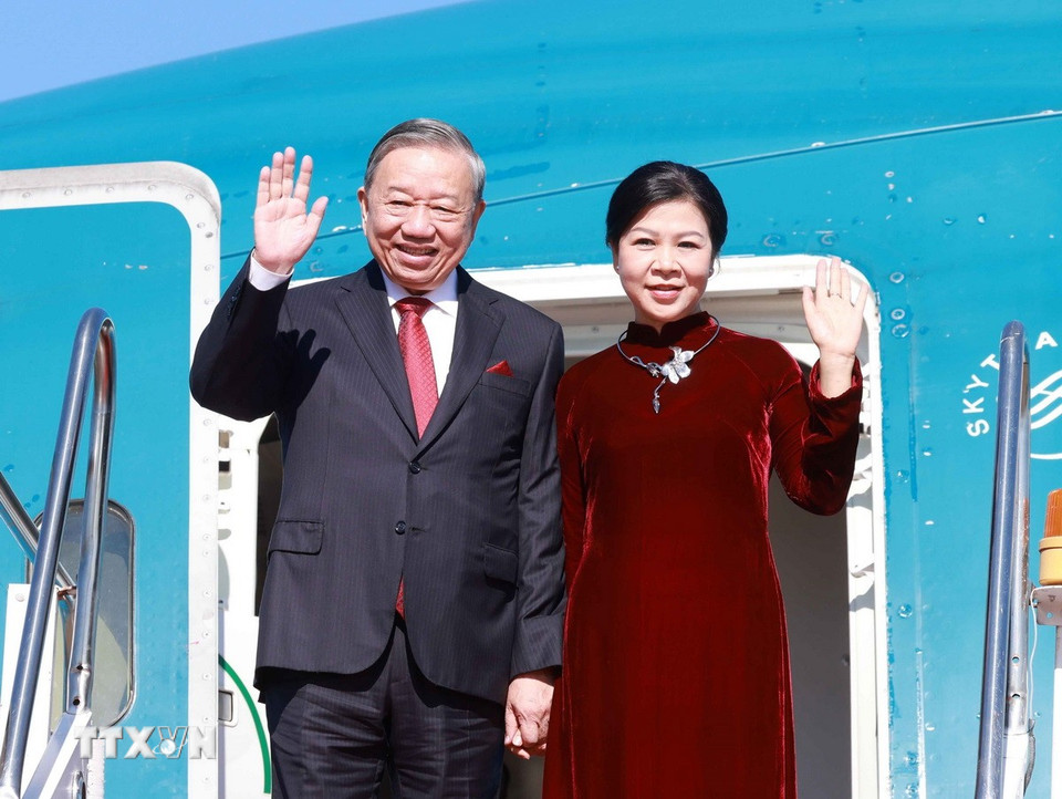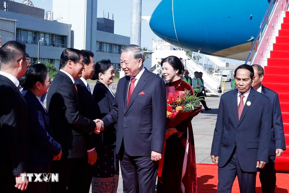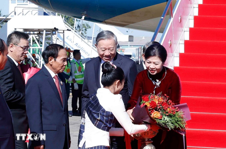 Tổng Bí thư Tô Lâm và Phu nhân tới sân bay quốc tế Wattay, thủ đô Vientiane. (Ảnh: Thống Nhất/TTXVN)