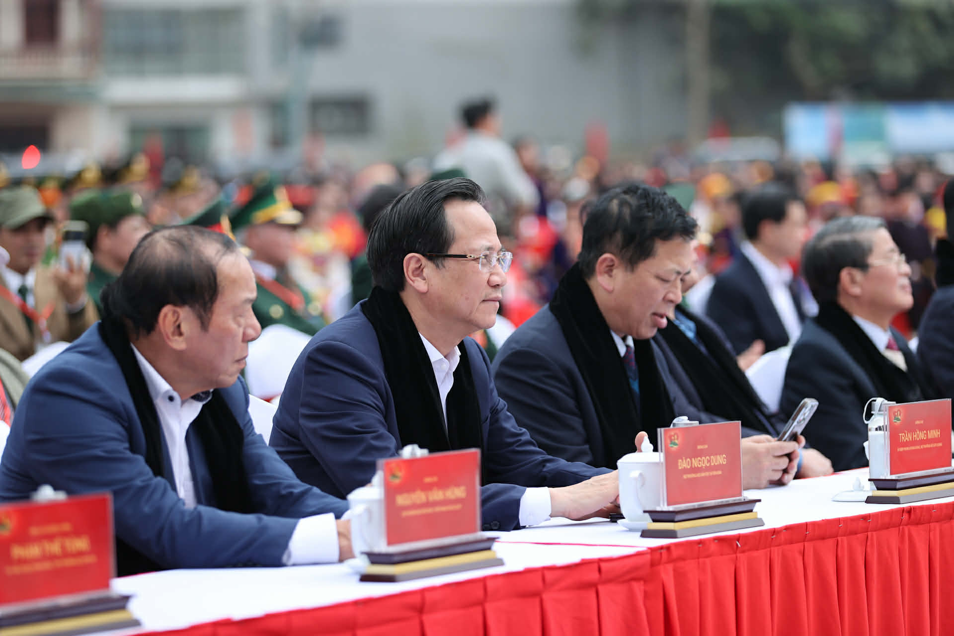 Bộ trưởng Dân tộc và Tôn giáo Đào Ngọc Dung, Bộ trưởng Văn hóa - Thể thao và Du lịch Nguyễn Văn Hùng, Bộ trưởng Xây dựng Trần Hồng Minh dự buổi gặp mặt, nói chuyện của Tổng Bí thư Tô Lâm với nhân dân tỉnh Cao Bằng. Ảnh: Lê Anh Dũng