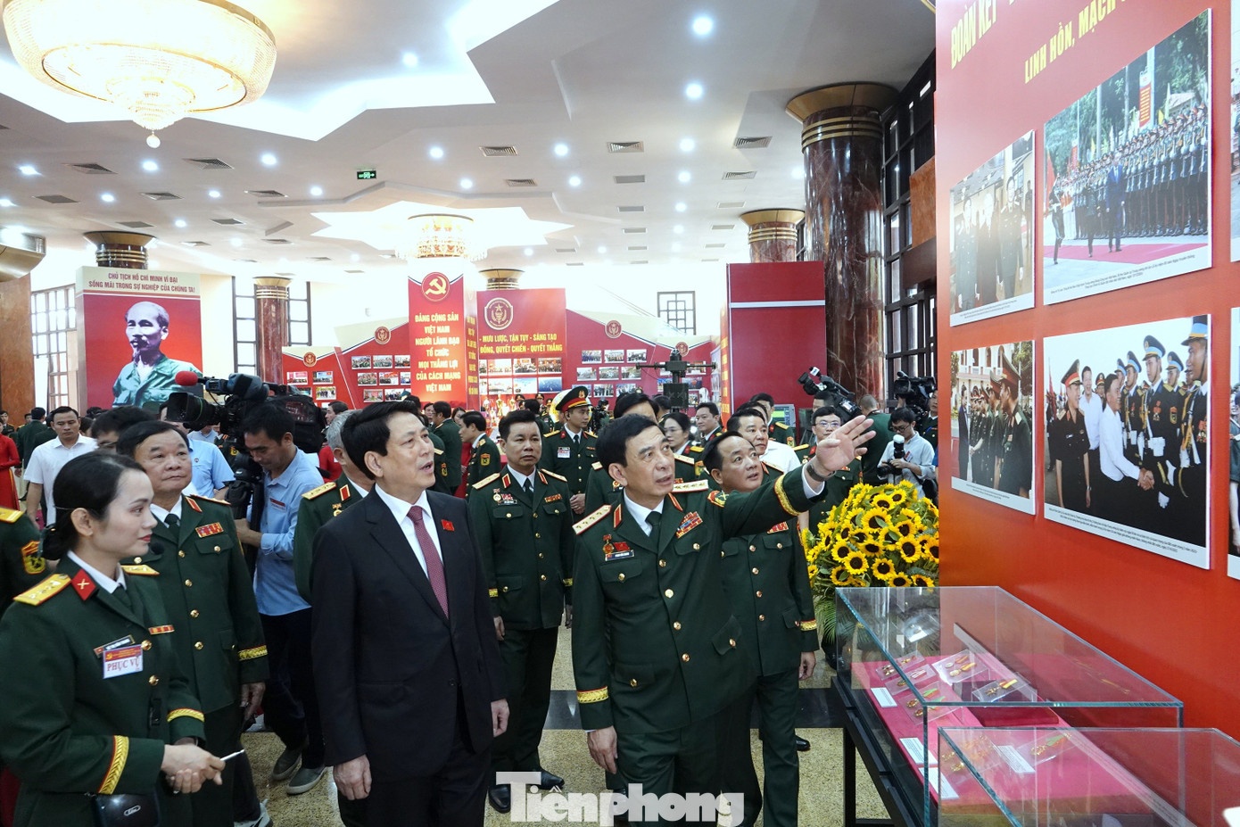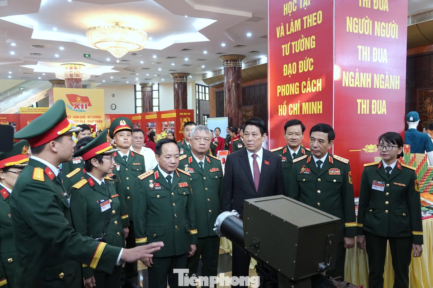 Đại tướng Phan Văn Giang, Ủy viên Bộ Chính trị, Phó bí thư Quân ủy Trung ương, Bộ trưởng Quốc phòng, giới thiệu với Chủ tịch nước Lương Cường về khu trưng bày của Đại hội.