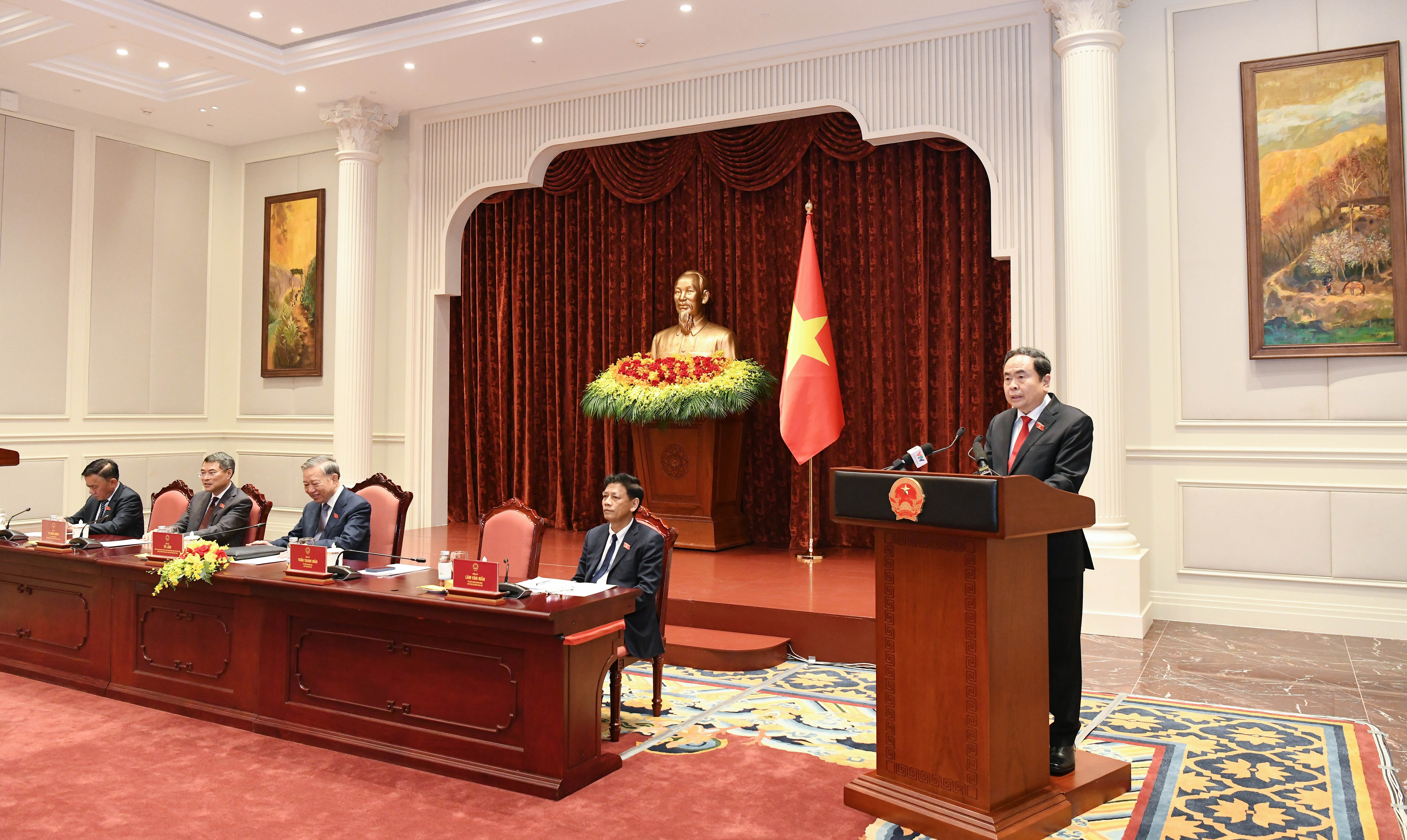 Thay mặt Ủy ban Thường vụ Quốc hội và các đại biểu Quốc hội, Chủ tịch Quốc hội Trần Thanh Mẫn trân trọng cảm ơn Tổng Bí thư, Chủ tịch nước Tô Lâm thời gian qua đã luôn dành sự quan tâm đặc biệt tronglãnh đạo, chỉ đạo, động viên, khuyến khích đối với Quốc hội, đại biểu Quốc hội.