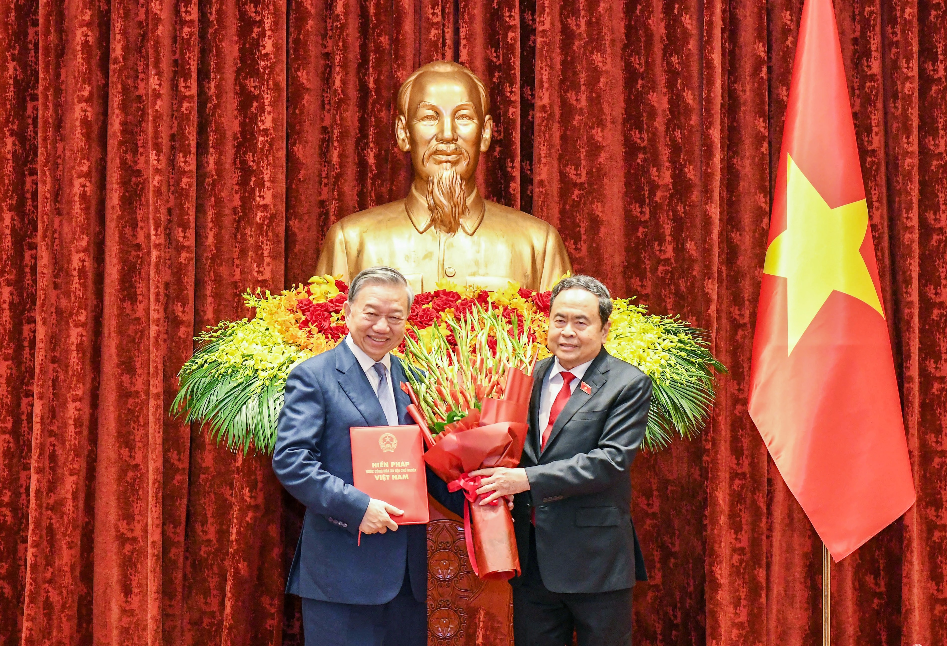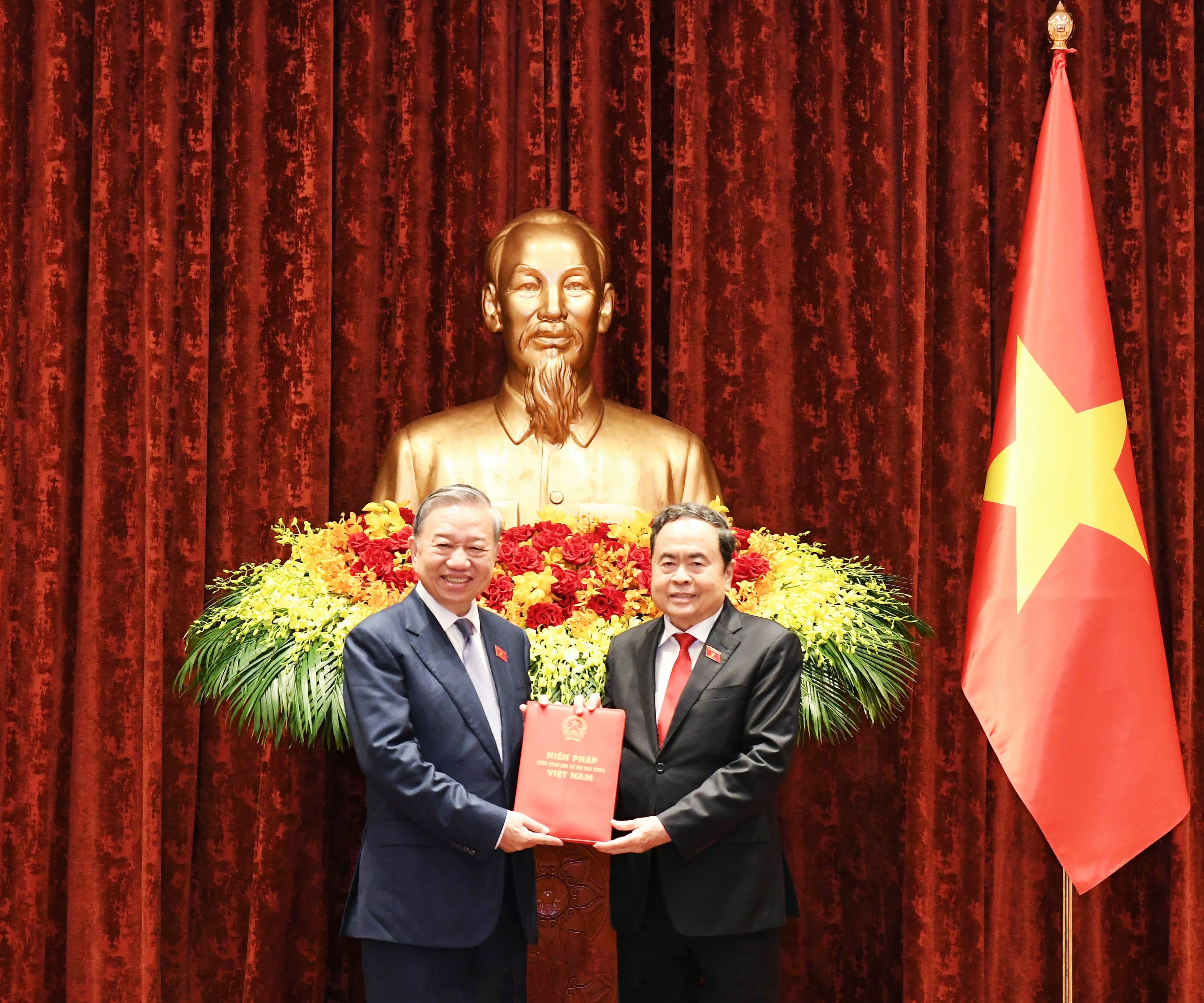 Chủ tịch Quốc hội Trần Thanh Mẫn tặng Tổng Bí thư, Chủ tịch nước Tô Lâm cuốn Hiến pháp Nước Cộng hòa Xã hội chủ nghĩa Việt Nam