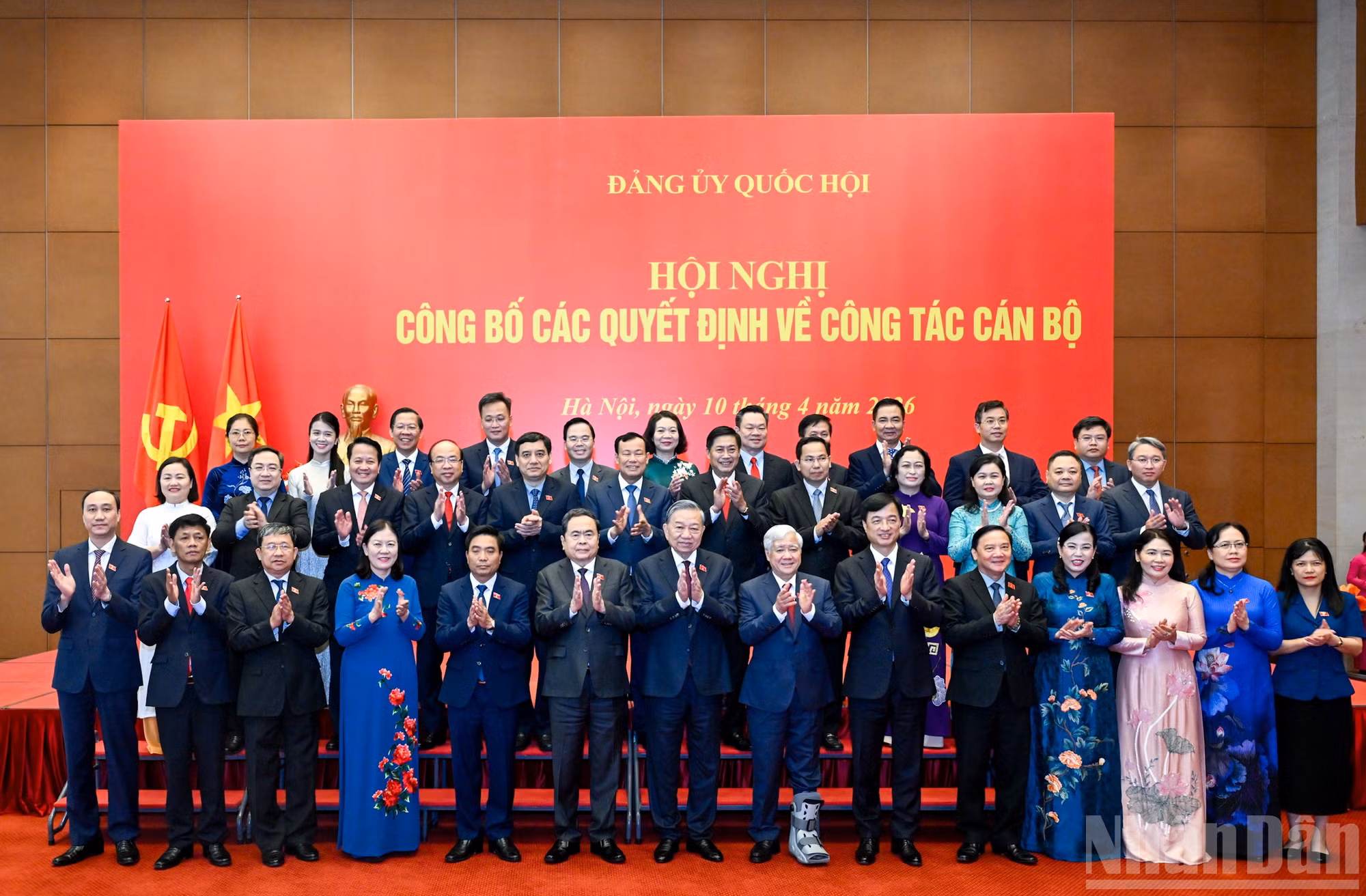 Tổng Bí thư, Chủ tịch nước Tô Lâm trao Quyết định của Bộ Chính trị về việc chỉ định Ban Chấp hành, Ban Thường vụ, Bí thư, Phó Bí thư Đảng ủy Quốc hội nhiệm kỳ 2025-2030 cho Chủ tịch Quốc hội Trần Thanh Mẫn và các Phó Chủ tịch Quốc hội. (Ảnh: DUY LINH)