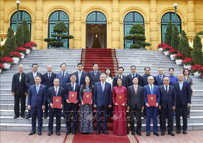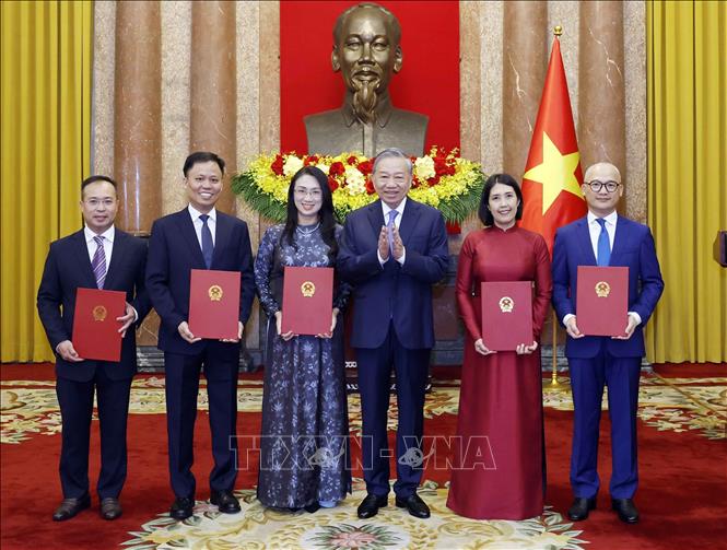 Tổng Bí thư, Chủ tịch nước Tô Lâm trao Quyết định bổ nhiệm cho 5 Đại sứ nước Cộng hòa xã hội Chủ nghĩa Việt Nam tại nước ngoài. Ảnh: Thống Nhất/TTXVN