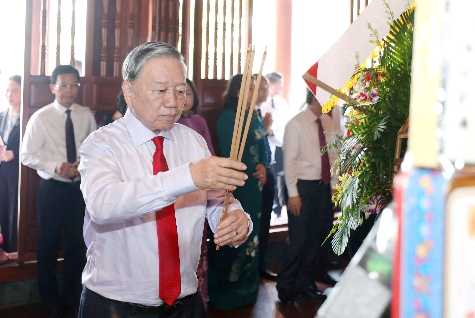 Tham dự Lễ dâng hương có các Ủy viên Bộ Chính trị: Thường trực Ban Bí thư Trung ương Đảng Trần Cẩm Tú; Bí thư Trung ương Đảng, Trưởng Ban Tổ chức Trung ương Nguyễn Duy Ngọc; Bí thư Trung ương Đảng, Chủ nhiệm Ủy ban Kiểm tra Trung ương Trần Sỹ Thanh; Bí thư Trung ương Đảng, Trưởng Ban Tuyên giáo và Dân vận Trung ương Trịnh Văn Quyết; Bí thư Trung ương Đảng, Trưởng ban Chính sách, chiến lược Trung ương Nguyễn Thanh Nghị; Phó Thủ tướng Thường trực Chính phủ Phạm Gia Túc; Bộ trưởng Bộ Công an, Đại tướng Lương Tam Quang; Giám đốc Học viện Chính trị Quốc gia Hồ Chí Minh Đoàn Minh Huấn.