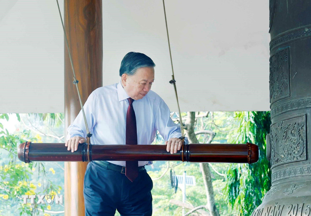 Tổng Bí thư, Chủ tịch nước Tô Lâm thỉnh chuông tại Nghĩa trang Liệt sỹ Tân Biên (Nghĩa trang Liệt sỹ Đồi 82). Ảnh: TTXVN