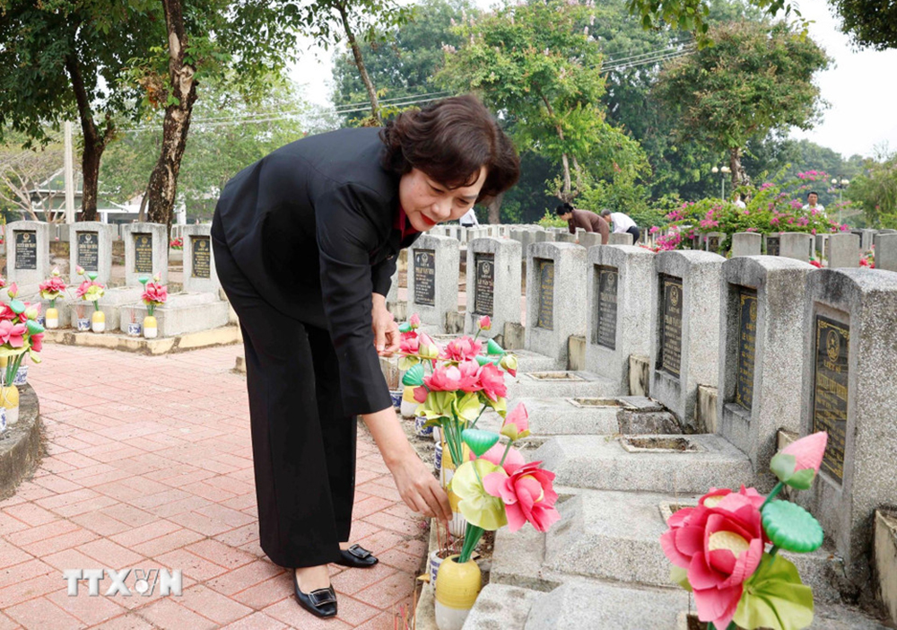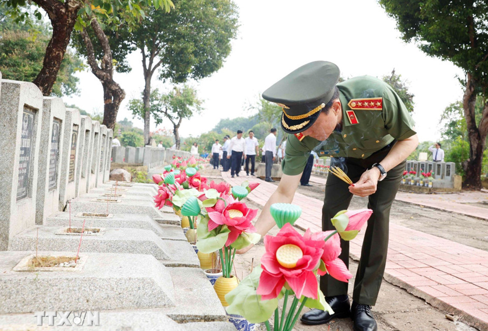 Đại biểu thắp hương tri ân các Anh hùng Liệt sỹ tại Nghĩa trang Liệt sỹ Tân Biên (Nghĩa trang Liệt sỹ Đồi 82). Ảnh: TTXVN