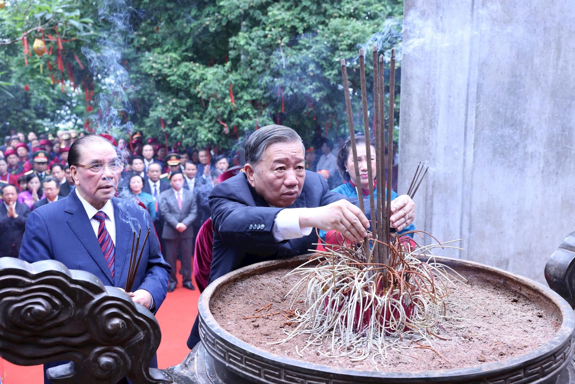 Tham dự Lễ dâng hương có các đồng chí: Nguyên Tổng Bí thư Nông Đức Mạnh; nguyên Ủy viên Bộ Chính trị, nguyên Chủ tịch Quốc hội Nguyễn Thị Kim Ngân. Các đồng chí Ủy viên Bộ Chính trị, Bí thư Trung ương Đảng: Bùi Thị Minh Hoài, Chủ tịch Ủy ban Trung ương Mặt trận Tổ quốc Việt Nam; Nguyễn Duy Ngọc, Trưởng ban Tổ chức Trung ương; Trần Sỹ Thanh, Chủ nhiệm Ủy ban Kiểm tra Trung ương; Trịnh Văn Quyết, Trưởng ban Tuyên Giáo và Dân vận Trung ương; Nguyễn Thanh Nghị, Trưởng ban Chính sách, chiến lược Trung ương; các đồng chí Ủy viên Bộ Chính trị: Đại tướng Phan Văn Giang, Phó Thủ tướng Chính phủ, Bộ trưởng Bộ Quốc phòng; Đại tướng Lương Tam Quang, Bộ trưởng Bộ Công an; Lê Hoài Trung, Bộ trưởng Bộ Ngoại giao; các đồng chí Bí thư Trung ương Đảng: Phạm Thị Thanh Trà, Phó Thủ tướng Chính phủ; Nguyễn Văn Quảng, Chánh án Tòa án nhân dân tối cao.