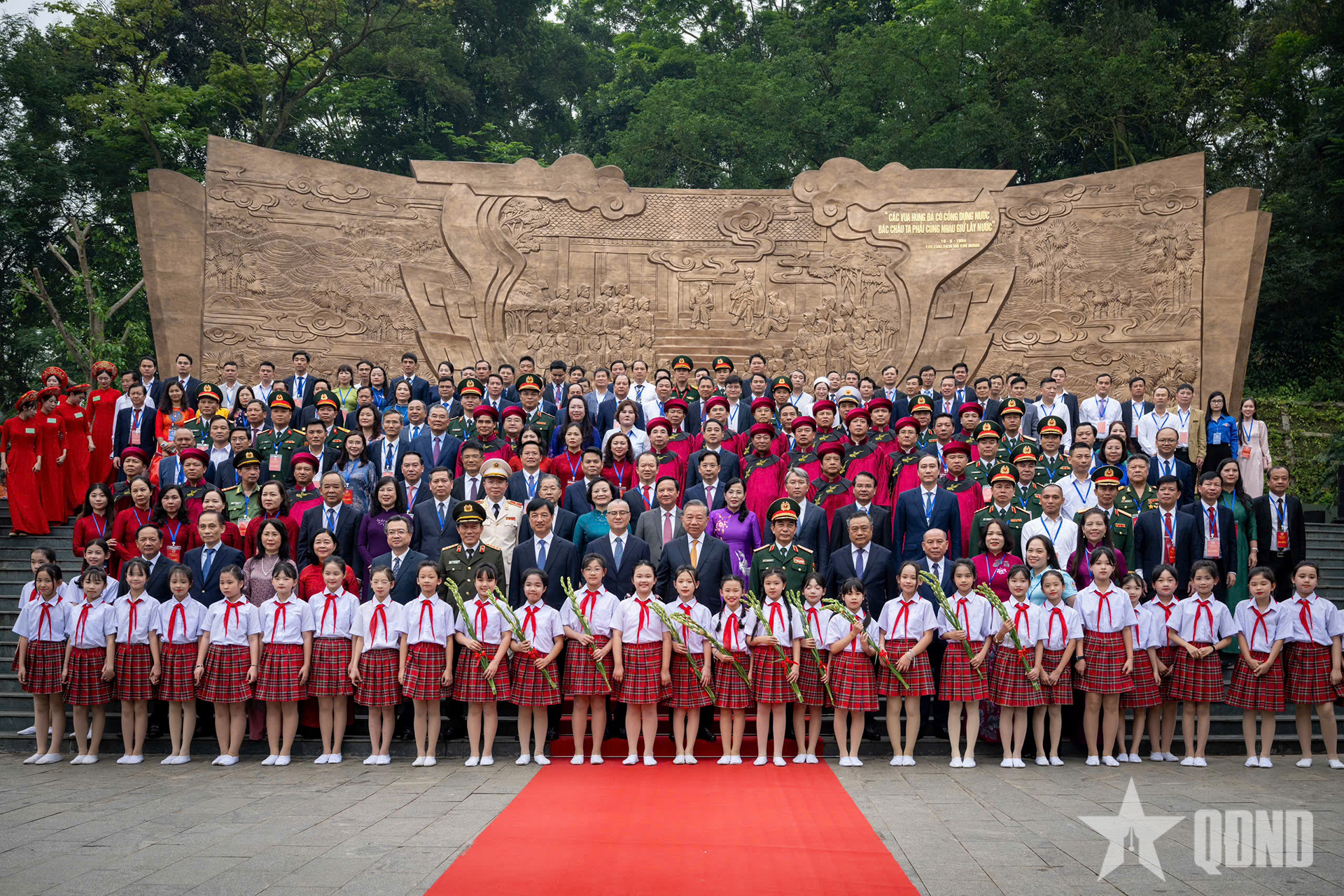 Tổng Bí thư, Chủ tịch nước Tô Lâm và các đại biểu chụp ảnh lưu niệm tại Bức phù điêu “Bác Hồ nói chuyện với cán bộ, chiến sĩ Đại đoàn Quân Tiên phong”. Ảnh: VIỆT TRUNG