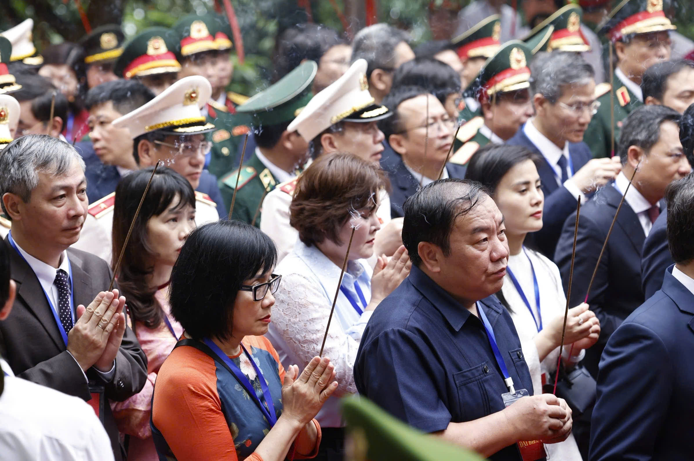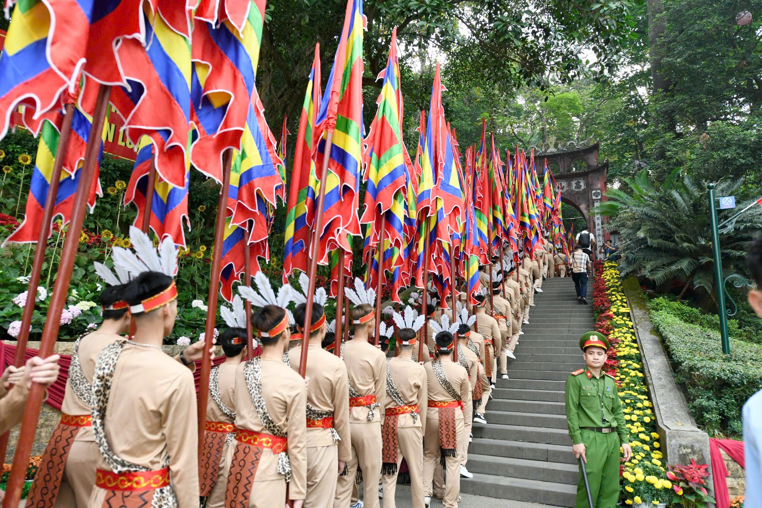 Khối đại biểu do Tổng Bí thư, Chủ tịch nước Tô Lâm dẫn đầu. Từ chân núi, đoàn đại biểu vượt qua 225 bậc đá để đến đền Hạ và chùa Thiên Quang; tiếp tục đi thêm 168 bậc, đoàn tới đền Trung - nơi tương truyền các Vua Hùng từng ngắm cảnh, bàn việc cùng các lạc hầu, lạc tướng; cũng là nơi hoàng tử Lang Liêu dâng bánh chưng, bánh giầy.