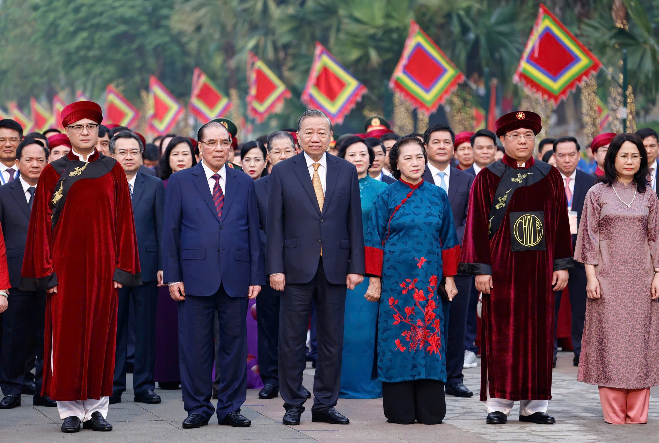 Tổng Bí thư, Chủ tịch nước Tô Lâm cùng lãnh đạo, nguyên lãnh đạo Đảng, Nhà nước trong lễ dâng hương tưởng nhớ các Vua Hùng. Ảnh: VIẾT CHUNG