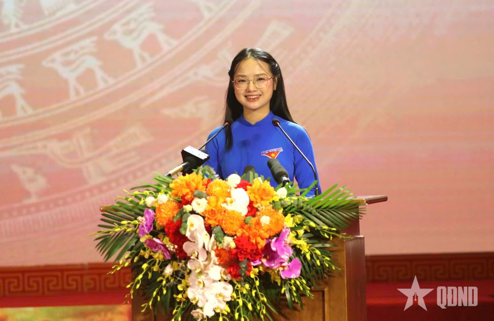 Đoàn viên Hồ Thị Ngọc Ly, đoàn viên Chi đoàn 12A2, Trường THPT Hà Huy Tập phát biểu tại lễ kỷ niệm.