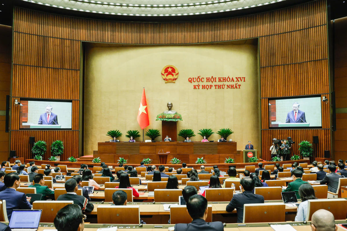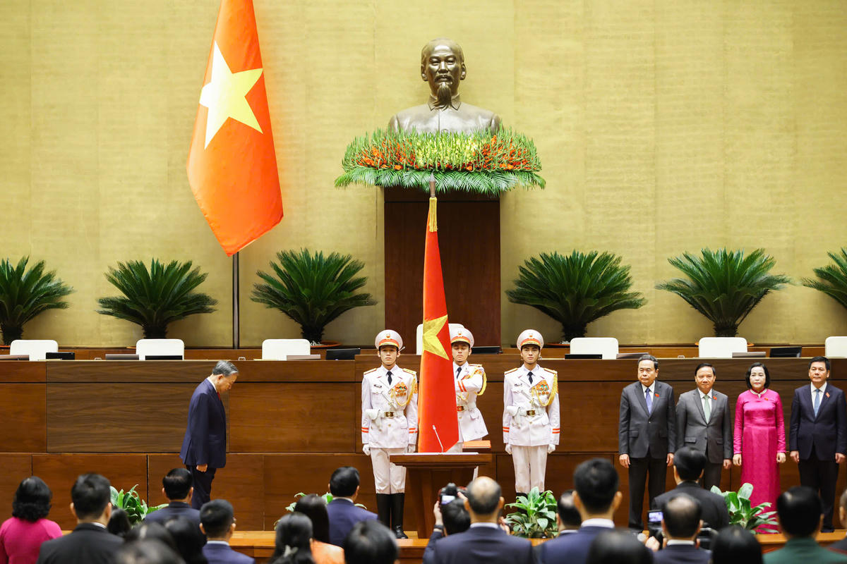 "Dưới cờ đỏ sao vàng thiêng liêng của Tổ quốc, trước Quốc hội, đồng bào và cử tri cả nước, tôi - Chủ tịch nước Cộng hòa xã hội chủ nghĩa Việt Nam, xin tuyên thệ: Tuyệt đối trung thành với Tổ quốc, với nhân dân, với Hiến pháp nước Cộng hòa xã hội chủ nghĩa Việt Nam, nỗ lực phấn đấu hoàn thành tốt mọi nhiệm vụ mà Đảng, Nhà nước và nhân dân giao phó", Tổng Bí thư, Chủ tịch nước Tô Lâm tuyên thệ.