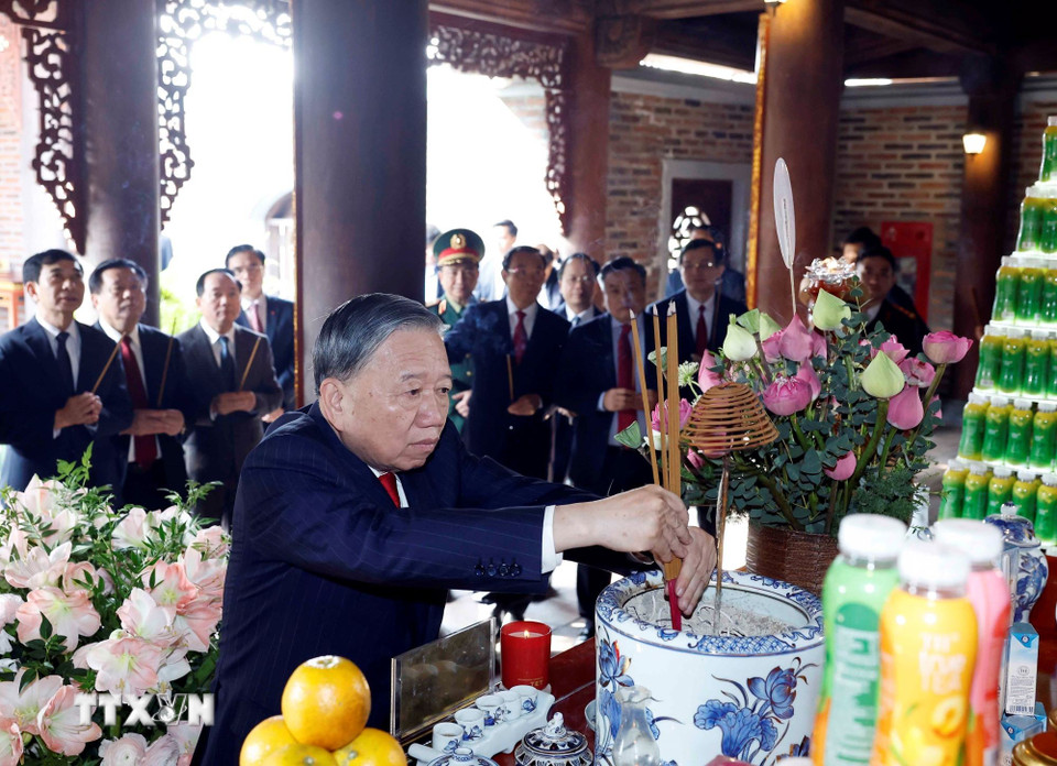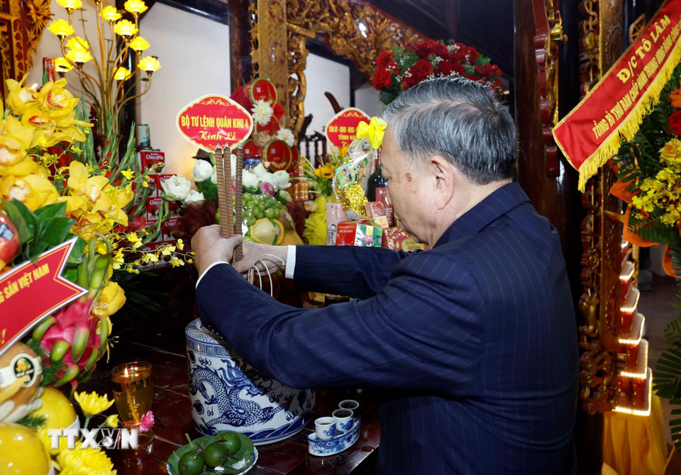 Tổng Bí thư Tô Lâm dâng hương tại Đền Chung Sơn thờ gia tiên Bác Hồ. (Ảnh: Thống Nhất/TTXVN)