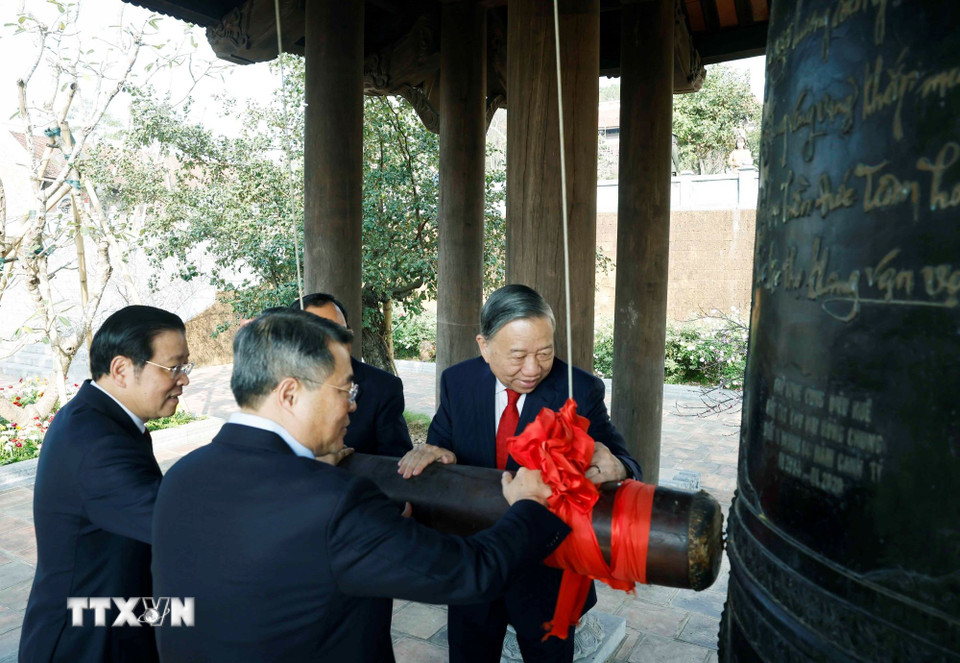 Tổng Bí thư Tô Lâm và các đại biểu thỉnh chuông tại Đền Chung Sơn. (Ảnh: Thống Nhất/TTXVN)