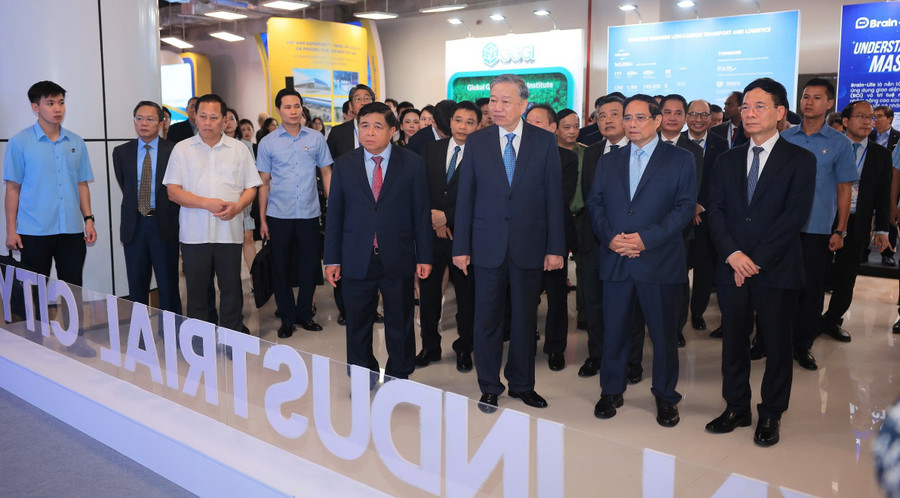 Tổng Bí thư Tô Lâm, Thủ tướng Phạm Minh Chính và các đại biểu tham quan Triển lãm Đổi mới sáng tạo.
