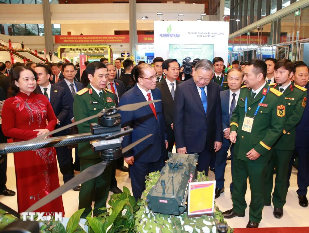 Tổng Bí thư Tô Lâm cùng các đồng chí lãnh đạo, nguyên lãnh đạo Đảng và Nhà nước tham quan các gian trừng bày tại đại hội.