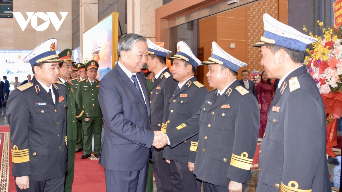 Tổng Bí thư Tô Lâm cùng các đại biểu chụp ảnh chung với lãnh đạo Bộ Quốc phòng và Quân chủng Hải quân