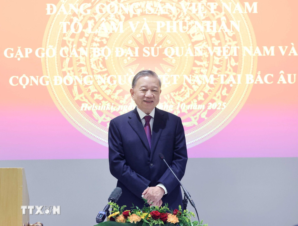 Tổng Bí thư Tô Lâm gặp gỡ cán bộ Đại sứ quán Việt Nam và cộng đồng người Việt tại Bắc Âu. (Ảnh: Thống Nhất/TTXVN)